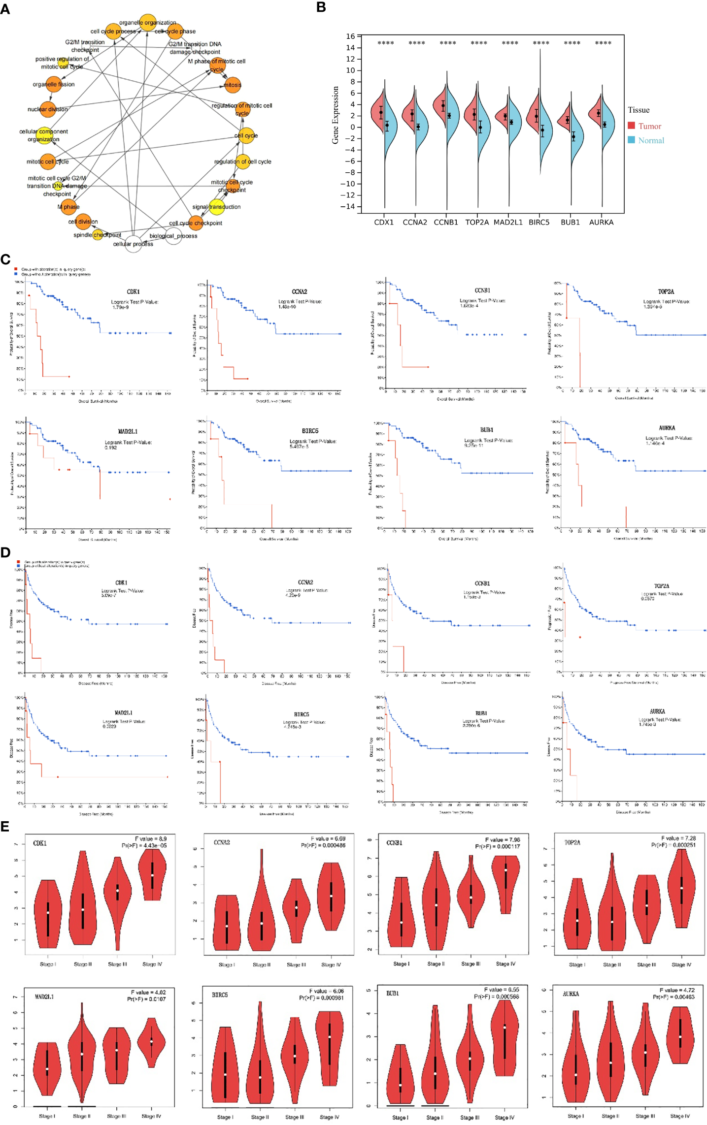 Analysis of hub genes. (A) The biological process analysis of hub genes. The color depth of nodes refers to the corrected P-value of ontologies. The size of nodes refers to the numbers of genes that are involved in the ontologies. P<0.0001 was considered statistically significant. (B) Violin plot of eight hub genes. ****: P<0.0001. Red represents the expression levels of hub genes in ACC tissues, while blue represents the expression levels of hub genes in normal tissues. (C) Overall survival analyses of hub genes. Logrank test P-value <0.05 was considered statistically significant. (D) Disease Free survival analyses of 7 hub genes and Progression Free survival analyses of TOP2A. The red line represents the survival rate of a group with alteration in query gene, while the blue line represents the survival rate of a group without alteration in query gene. Logrank test P-value <0.05 was considered statistically significant. (E) Correlation between hub genes and tumor stage in ACC patients (GEPIA). ACC, adrenocortical carcinoma.