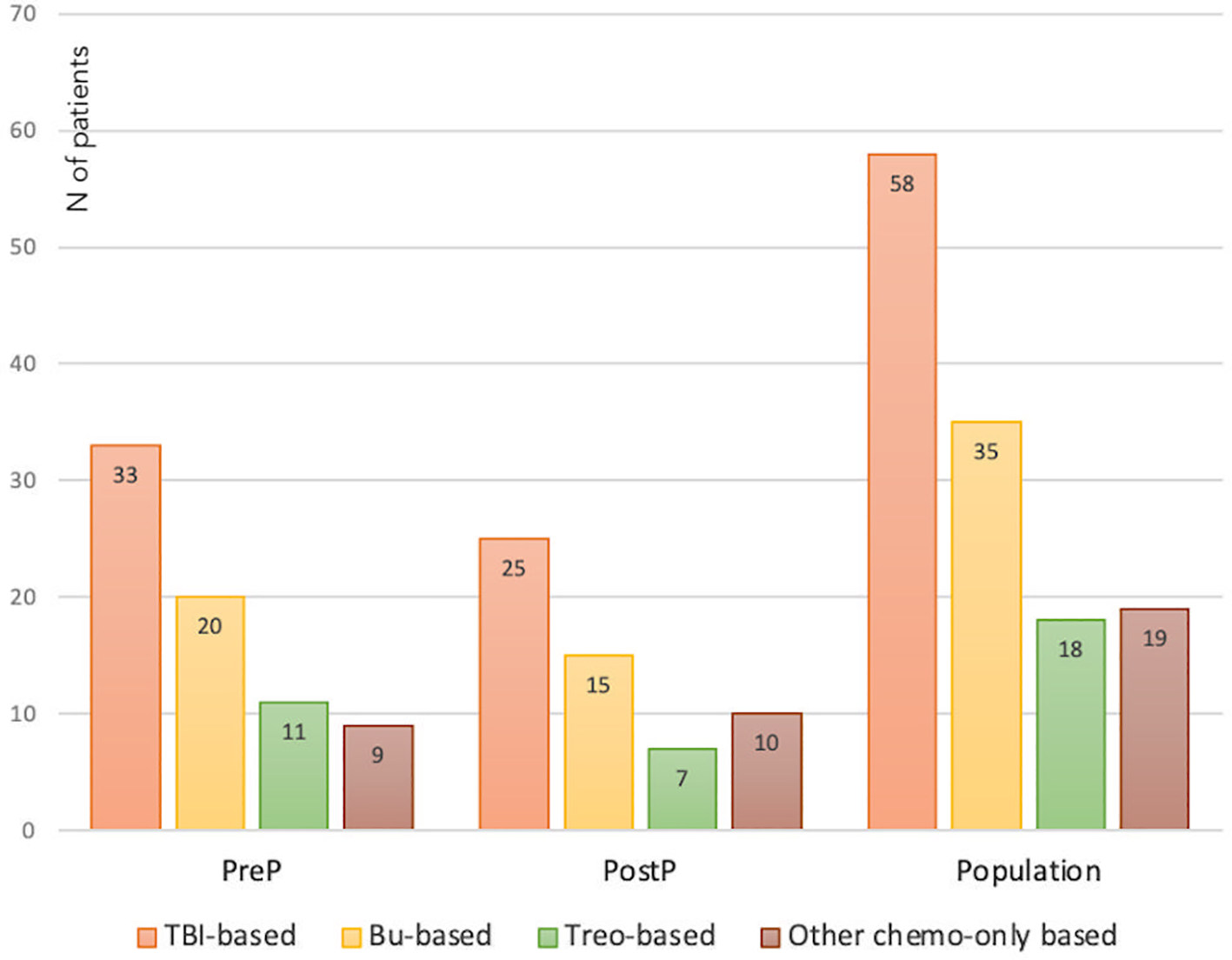 Distribution of the whole study population and of the PreP and PostP subcohorts with reference to the conditioning regimen administered before HSCT. TBI, total body irradiation; Bu, Busulfan; Treo, Treosulfan.