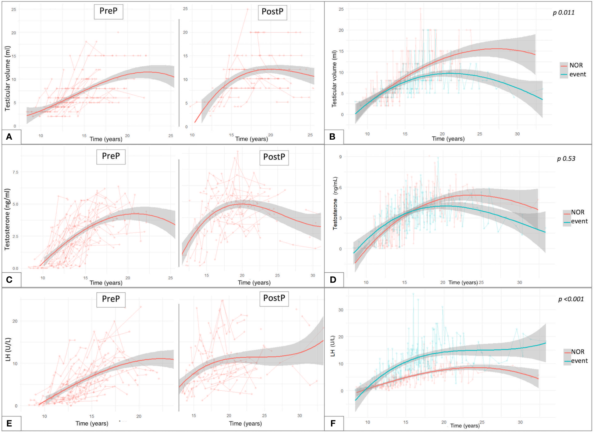 The temporal trends of testicular growth, testosterone and LH values among patients from the PreP versus the PostP cohorts were estimated by a nonparametric regression model using cubic splines.