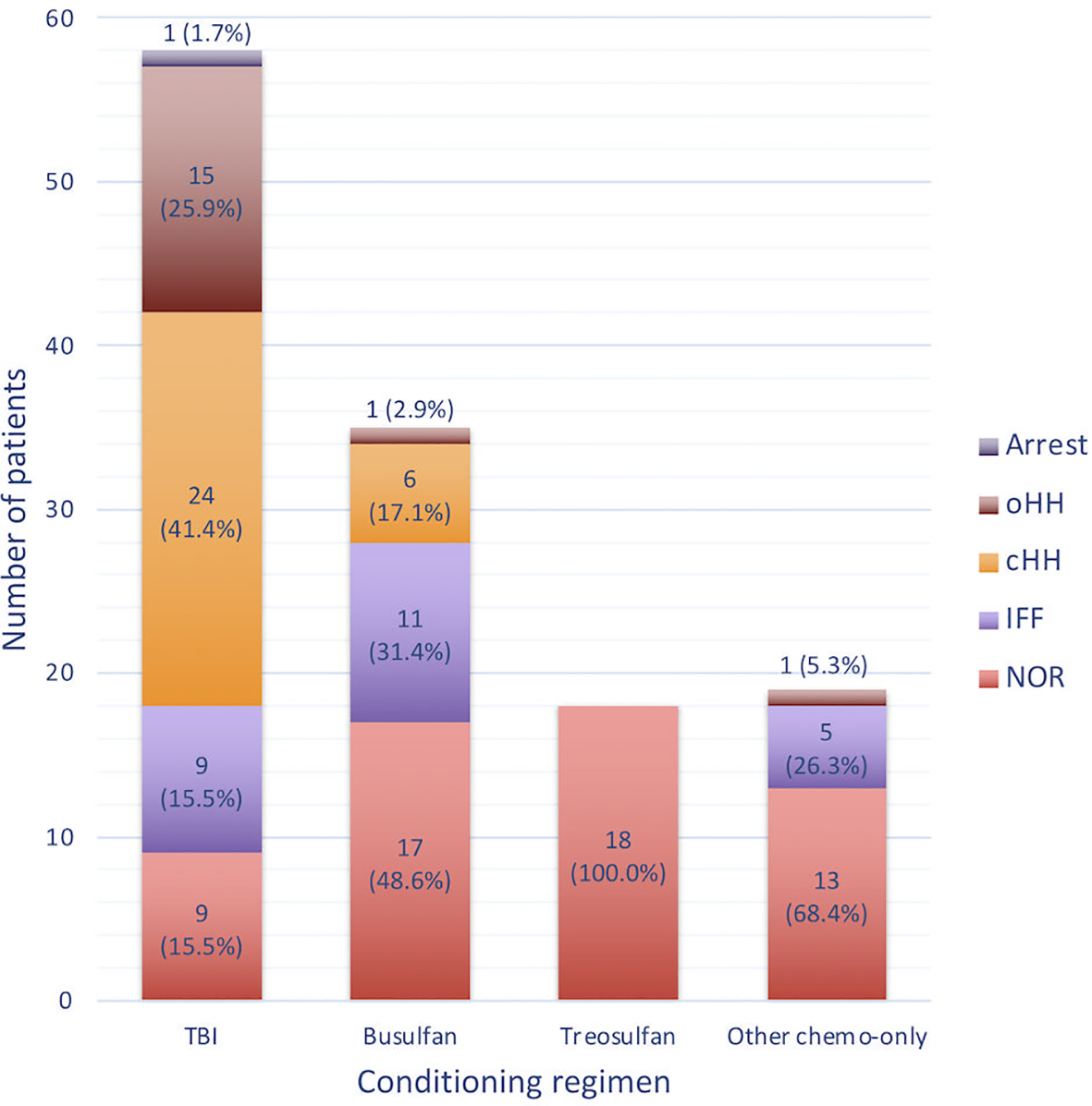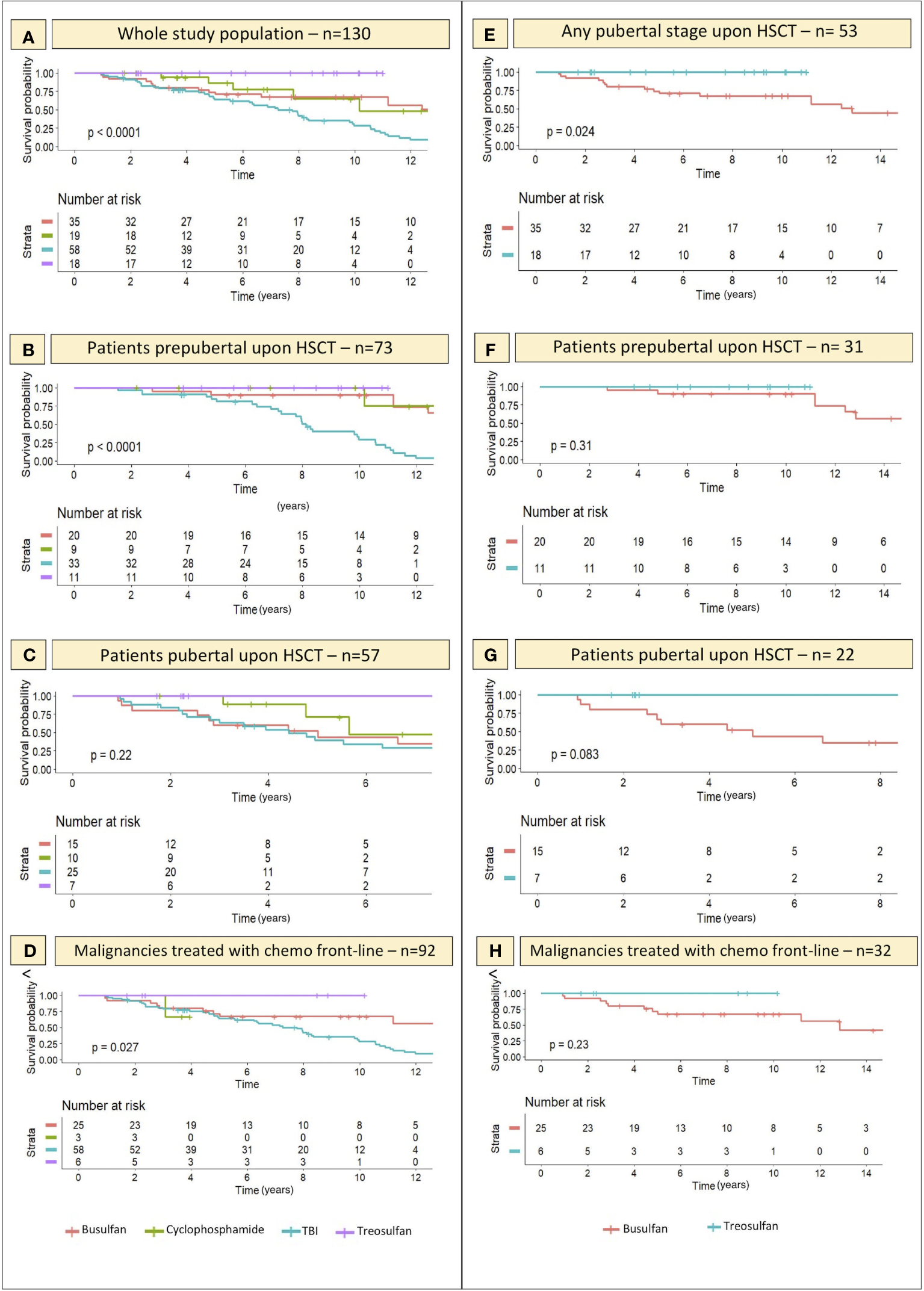 In order to assess the detrimental effect played by different conditioning regimens, all patients were grouped in the following classes, based on the conditioning administered at HSCT: a) TBI-based; b) Busulfan-based; c) Treosulfan-based; d) other chemo-only regimens, that included all those patients exposed to none of the abovementioned alkylating agents.
