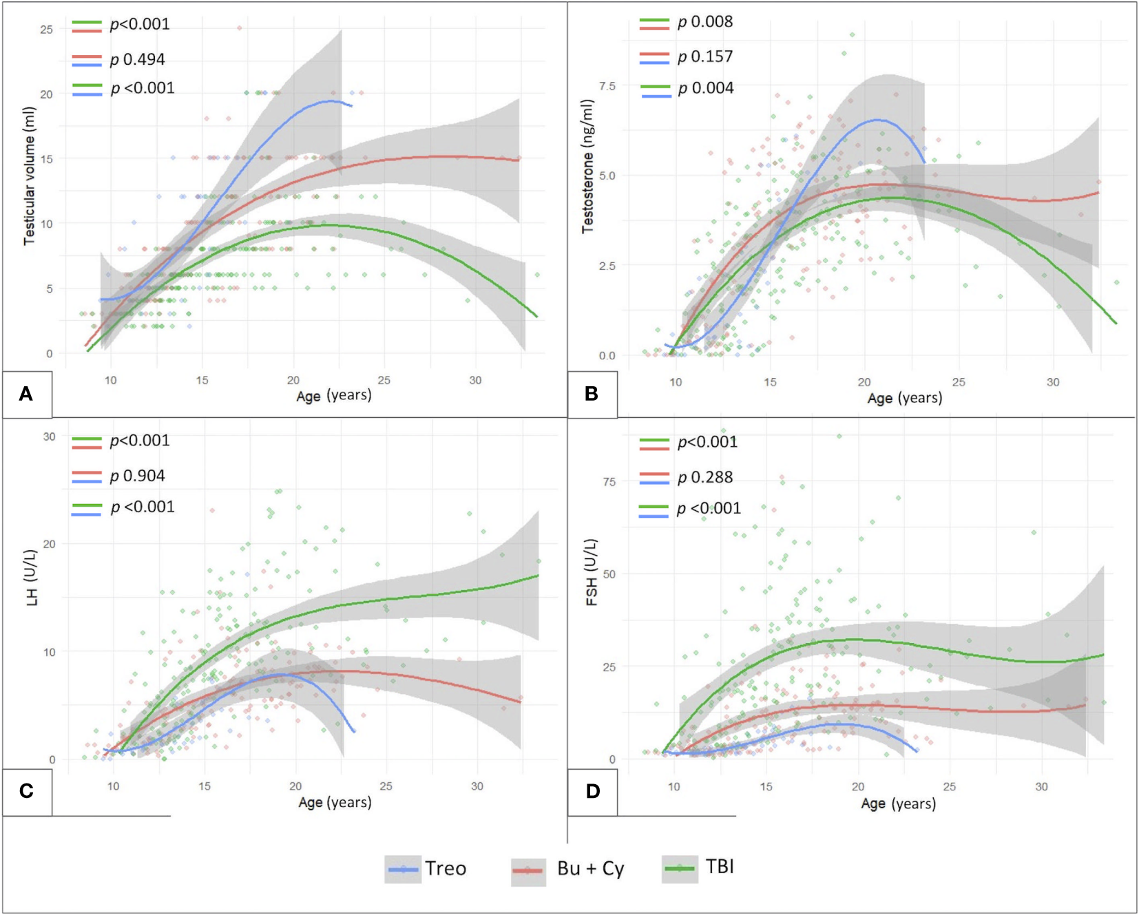 Finally, our data confirmed also in male patients the gonadal-sparing profile of treosulfan compared to busulfan-based regimens, with a statistically lower occurrence of hypogonadism and a trend towards larger testicular volume, higher testosterone levels and lower gonadotropins upon a systematical longitudinal assessment.