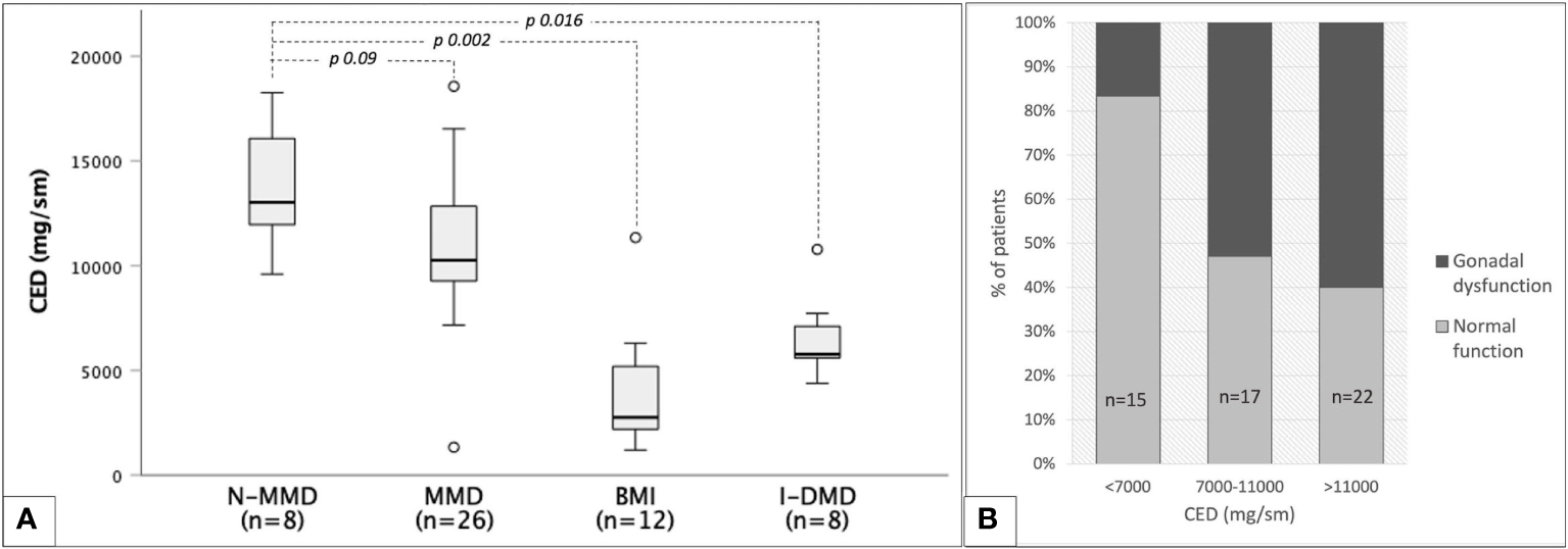 In order to assess the potential detrimental contribution of chemotherapy on gonadal health, we estimated for each patient the overall dose of alkylating agents administered before HSCT, either as front-line treatment or as a part of the conditioning regimen. As patients receive polychemotherapy and are therefore exposed to several antineoplastic agents, the dose of each alkylating medication was normalized into the corresponding dose of cyclophosphamide (CED - cyclophosphamide equivalent dose) with a dedicated algorithm: CED (mg/m2) = 1.0 [cumulative cyclophosphamide dose (mg/m2)] + 0.244 [cumulative ifosphamide dose (mg/m2)]+0.857 [cumulative procarbazine dose (mg/m2)]+ 14.286 [cumulative chlorambucil dose (mg/m2)]+15.0 [cumulative carmustine dose (mg/m2)]+ 16.0 [cumulative lomustine dose (mg/m2)] + 40 [cumulative melphalan dose (mg/m2)]+50 [cumulative thiotepa dose (mg/m2)]+100 [cumulative chlormethine dose (mg/m2)]+8.823 [cumulative busulfan dose (mg/m2)] (12). Accordingly, CED was assessed to quantify the overall exposure to gonadotoxic treatments and to compare different antineoplastic protocols.