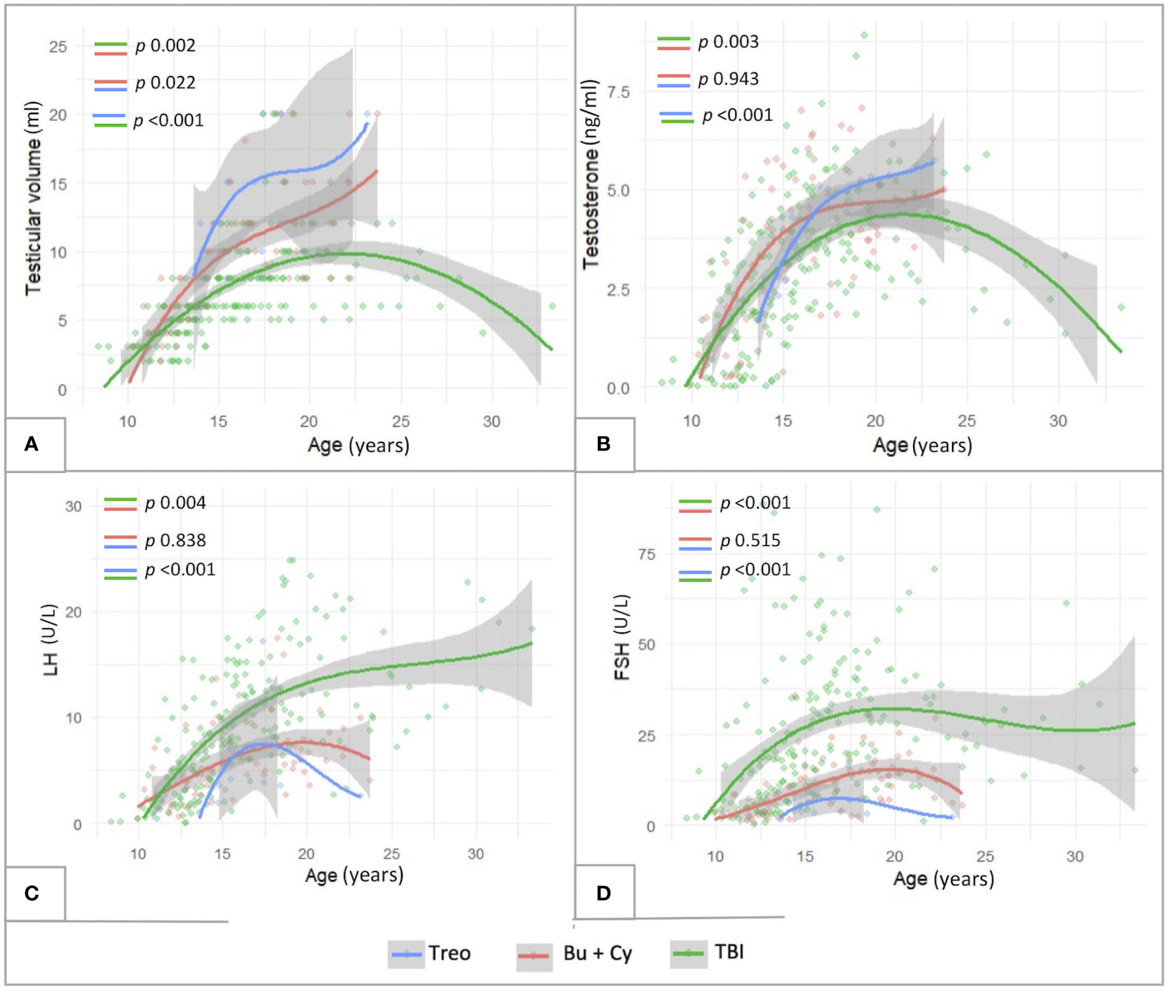 Firstly, by reporting the longitudinal trendlines of clinical and biochemical markers of testicular function over a dedicated three-decade endocrine follow-up, we demonstrated that patients prepubertal upon transplantation were exposed to a reduced risk of developing hypogonadism following HSCT, despite overall smaller testicular volume achieved in adulthood.