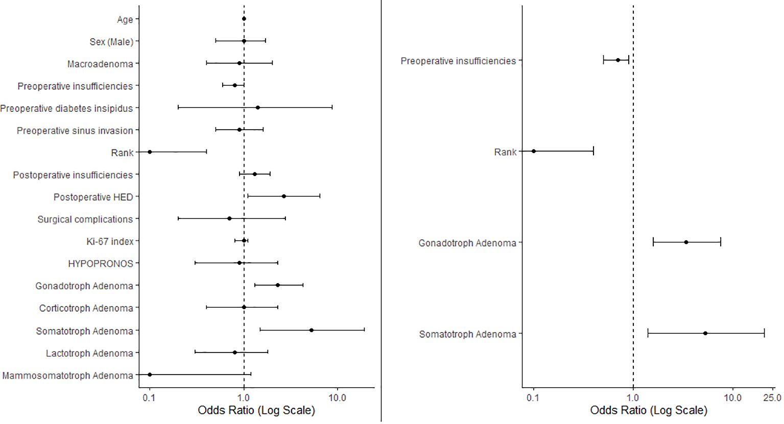 The primary aim of this study was to identify predictive factors associated with onset of de-novo clinically significant pituitary insufficiencies following endoscopic endonasal surgery (EES) for pituitary adenomas. The secondary objective explored the predictive factors of surgical success