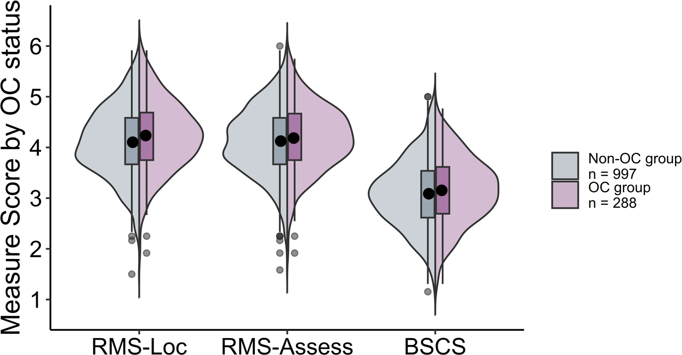 Figure 2 Split violin plot with box and whisker plots (boxplots) for each of the measures (RMS-Locomotion, RMS-Assessment, and BSCS) as a function of OC group (Non-OC vs. OC) in Study 2.