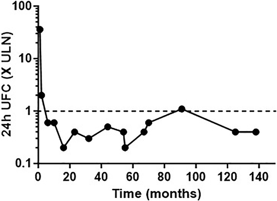 Urinary free cortisol (UFC) concentrations expressed as the number of times the upper limit of normal (ULN), following long-term cabergoline treatment.