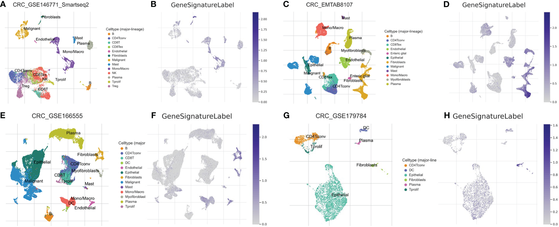 Single-Cell Transcriptomic Analysis. Expression analysis of a 10-gene signature in fibroblasts based on single-cell transcriptomics data in GSE146771 (A, B), EMTAB8107 (C, D), GSE166555 (E, F) and GSE179784 (G, H) database.