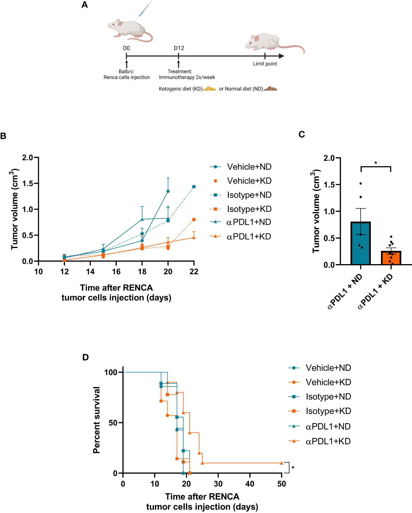 The efficacy of immunotherapy treatment is improved by adjuvant KD. (A) Balb/c mice were grafted with Renca cells at day 0 and treated with KD or not from day 12 to the end of the experiment. (B) Measurements of tumor volumes were assessed three times a week during 4 weeks for each group (10 mice per groups) exposed or not to KD and receiving anti-PDL1 mAb (αPDL1+ND or αPDL1+KD groups), isotype control (isotype+ND and isotype+KD groups) and PBS controls (vehicle+ND and vehicle+KD groups). (C) Comparison of tumor volume at day 18 between groups treated by anti-PDL1 and exposed to KD or ND. (D) Survival of mice exposed to KD or ND, treated with anti-PDL1 mAb or isotype control or PBS (vehicle) after grafting of Renca cells. (C) Statistical significance was determined using Mann-Whitney U test. Data are presented as mean ± SEM. (D) Survival curves were done using Kaplan-Meier method and compared using the Log-rank test. *P<0.05.