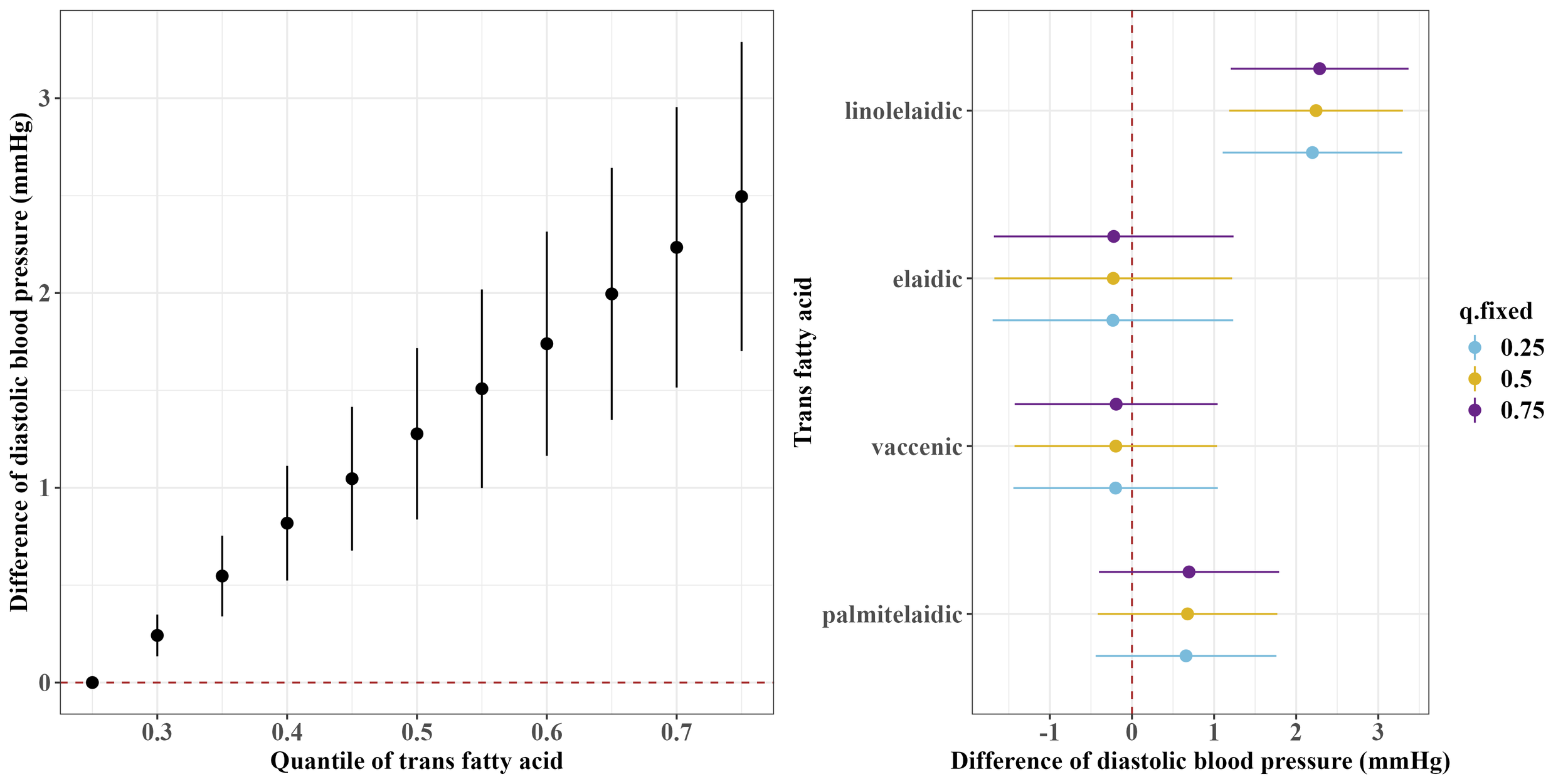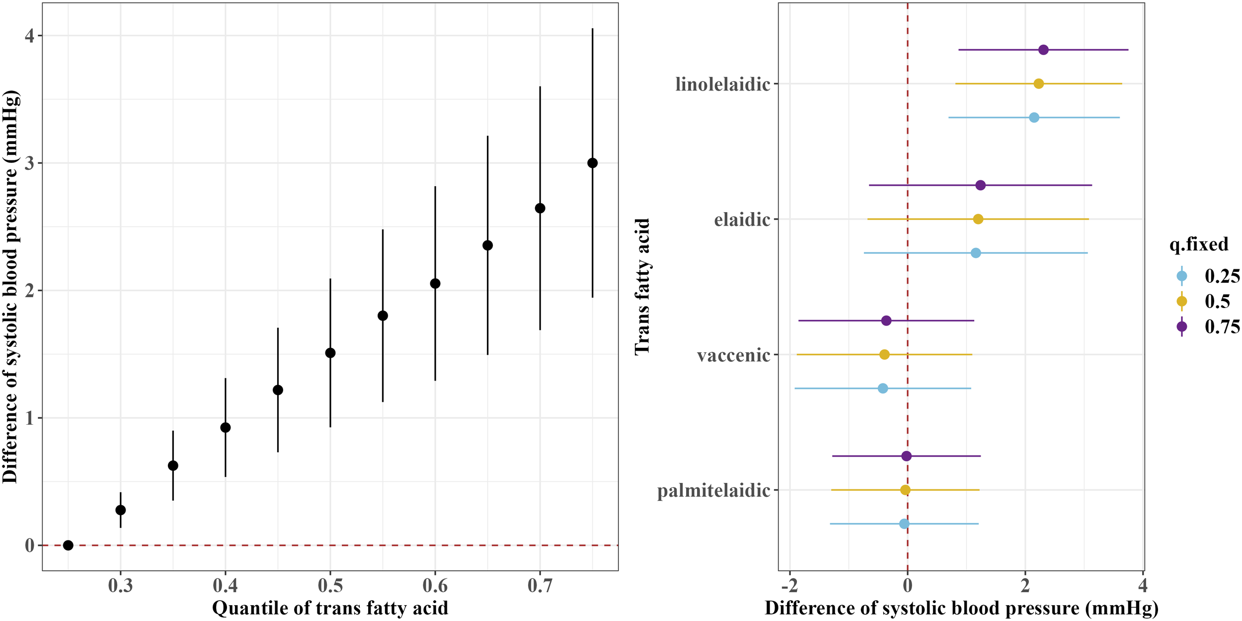The concentrations of TFAs were natural logarithms (ln) transformed to approximate a normal distribution. Multivariate linear regression models showed that each 1-unit increase in ln-transformed plasma concentrations of palmitelaidic, elaidic, vaccenic, and linolelaidic acids was associated with separate 2.94-, 3.60-, 2.46- and 4.78-mm Hg and 2.77-, 2.35-, 2.03-, and 3.70- mm Hg increase in SBP and DBP, respectively (P < 0.05). The BKMR model showed positive associations between the four TFAs mixtures and SBP and DBP. In addition, linolelaidic acid contributed the most to an increased blood pressure. Similar results were observed with the threshold of hypertension (≥130/80 mm Hg).