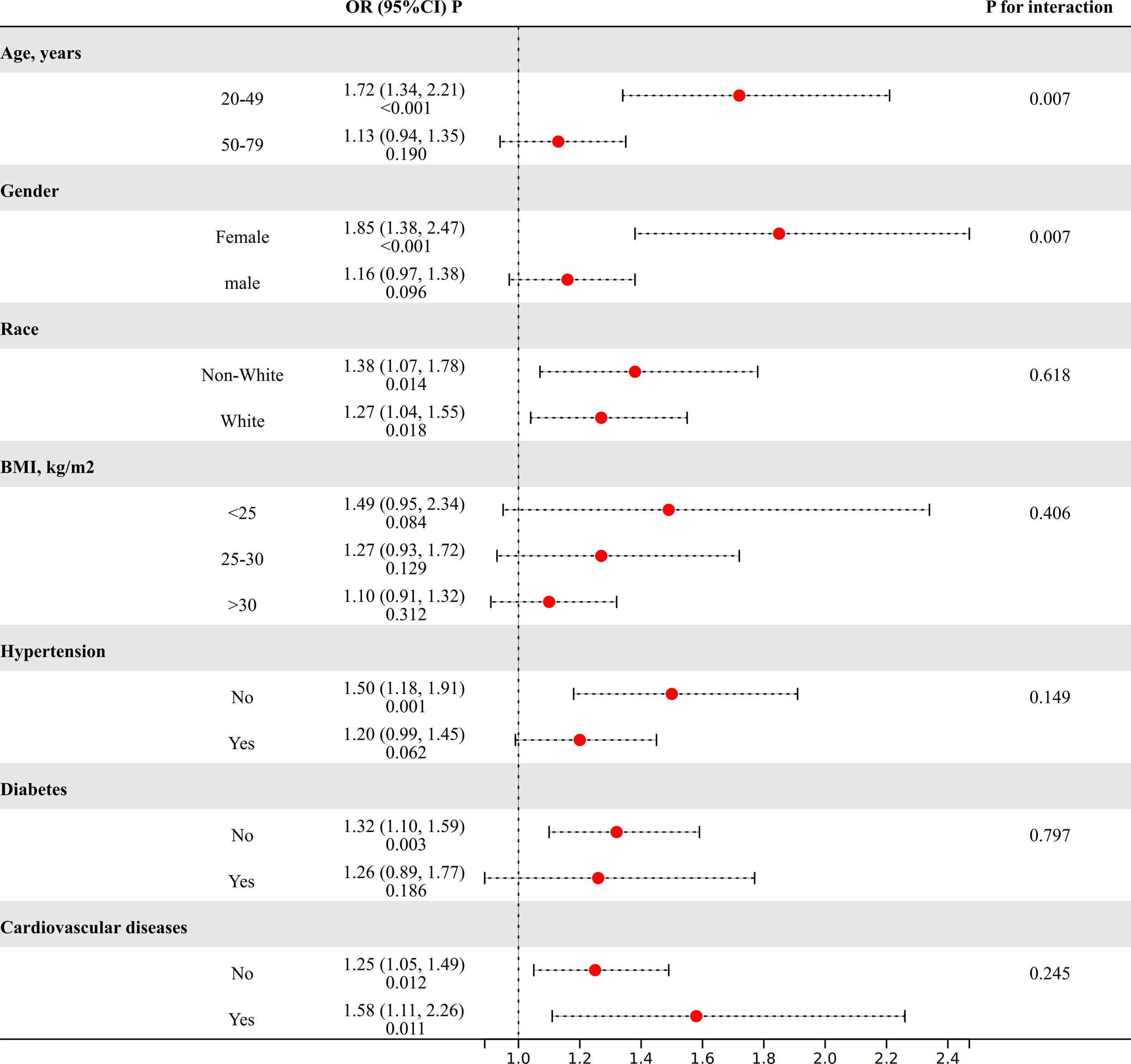 Demographic data (age, gender, and race) was obtained, along with various potential covariates such as annual household income, educational level, smoking status, hypertension, diabetes, cardiovascular disease, body mass index (BMI, kg/m2), alanine transaminase (ALT, U/L), aspartate transaminase (AST, U/L), gamma-glutamyl transferase (GGT, U/L), glycohemoglobin, triglycerides (TG, mmol/L), total cholesterol (TC, mmol/L), low-density lipoprotein cholesterol (LDL-c, mmol/L), blood urea nitrogen (BUN, mmol/L), serum creatinine (Scr, μmol/L), and serum uric acid (SUA, μmol/L). BMI is categorized as follows: <25 kg/m2 (normal weight), 25-29.9 kg/m2 (overweight), ≥30 kg/m2 (obesity). Smokers were identified as current or former smokers. Additionally, self-reported diabetes, hypertension, and cardiovascular disease were recorded. The presence of cardiovascular disease was determined based on self-reported history of heart attack, stroke, congestive heart failure, coronary artery disease, or angina. Comprehensive measurement procedures for all variables were publicly accessible in the NHANES database.