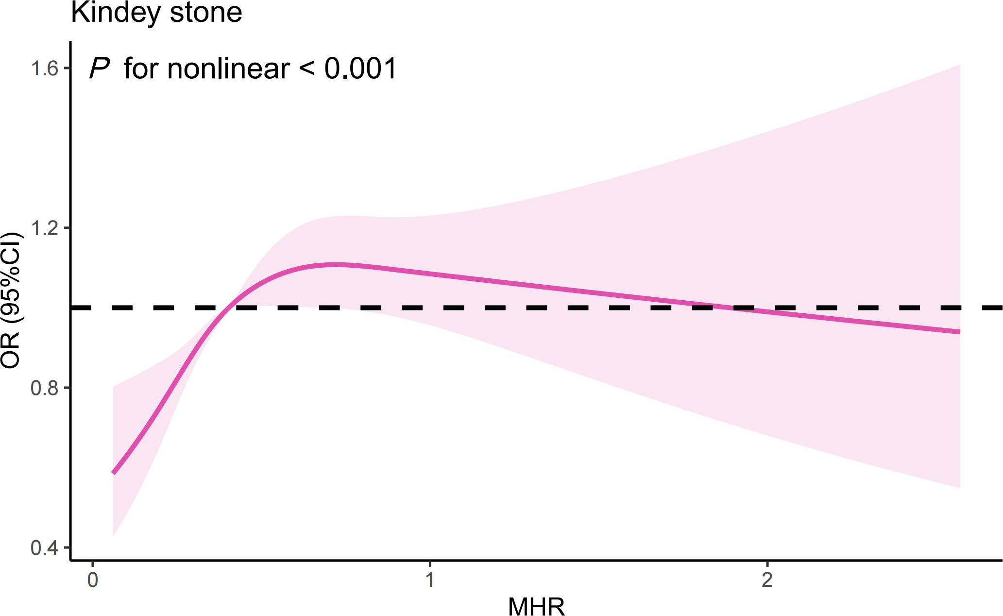 This study included 28,878 participants, and as the quartile range of the MHR increased, the proportion of kidney stones also rose progressively (7.20% to 8.89% to 10.88% to 12.05%, P<0.001). After adjusting for confounding factors, MHR was independently associated with an increased risk of kidney stones (OR=1.31, 95%CI=1.11-1.54, P=0.001), also independent of some common inflammatory indices. Subgroup analysis suggested that the relationship between MHR and kidney stones was more pronounced in female and individuals aged 20-49. Further restricted cubic spline (RCS) analysis indicated a nonlinear relationship between MHR and the risk of kidney stones.