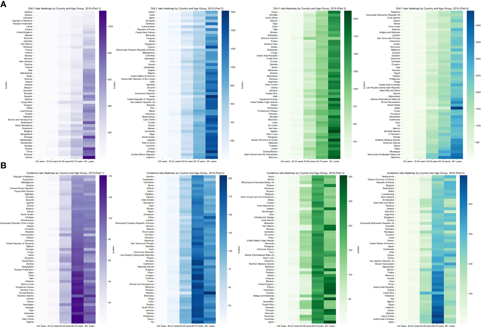 The Global Burden of Disease (GBD) 2019 is a comprehensive international initiative that provides estimates on the impact of 369 diseases and injuries across 204 countries and territories from 1990 to 2019 (10). To gather data for each specific disease or injury, the GBD utilizes a wide range of sources including 7,333 national and 24,657 sub-national vital registration systems, 16,984 scholarly publications, and 1,654 household surveys, as well as other relevant sources such as population censuses, healthcare usage records, and satellite imagery (10). This study is updated annually to incorporate refinements to the range of diseases, data sources, and methodologies. These updates aim to accurately capture yearly variations in the same diseases and injuries, stratified by age, sex, country, and region, using standard epidemiological and health metrics such as incidence, prevalence, mortality rates, and DALYs (10).