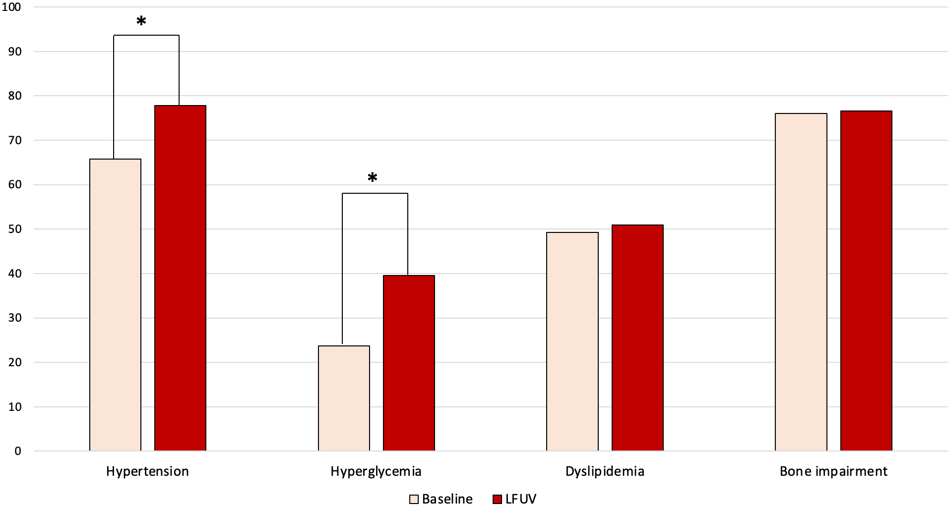 Changes over time in comorbidities of male patients with adrenal incidentaloma. LFUV, last follow-up visit. * indicates statistically significant difference (p < 0.05).