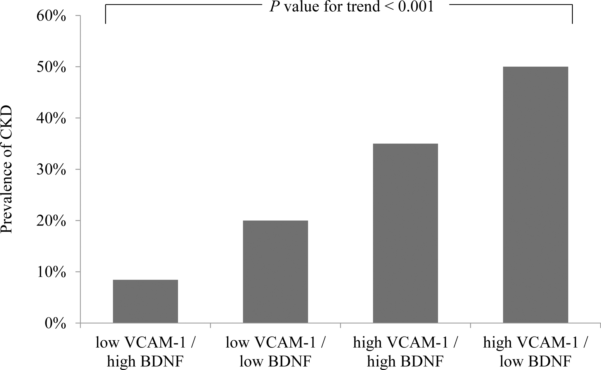 Of the 548 enrolled participants, 156 had CKD. Patients with CKD exhibited significantly lower BDNF (median of 21.4 ng/mL, interquartile range [IQR]: 17.0–27.0 ng/mL vs. median of 25.9 ng/mL, IQR: 21.0–30.4 ng/mL, P <0.001) and higher VCAM-1 (median of 917 ng/mL, IQR: 761–1172 ng/mL vs. median of 669 ng/mL, IQR: 552–857 ng/mL, P <0.001) levels than those without CKD. Serum BDNF levels were inversely correlated with VCAM-1 levels (Spearman’s rank correlation coefficient = -0.210, P <0.001). The patients were divided into four subgroups based on median BDNF and VCAM-1 levels (24.88 ng/mL and 750 ng/mL, respectively). Notably, patients in the high VCAM-1 and low BDNF group had the highest prevalence (50%) of CKD. Multivariate logistic regression revealed a significantly higher odds ratio (OR) of CKD in the high VCAM-1 and low BDNF group (OR = 3.885, 95% CI: 1.766–8.547, P <0.001), followed by that in the high VCAM-1 and high BDNF group (OR = 3.099, 95% CI: 1.373–6.992, P =0.006) compared with that in the low VCAM-1 and high BDNF group. However, the risk of CKD in the low VCAM-1 and low BDNF group was not significantly different from that in the low VCAM-1 and high BDNF group (P =0.266).
