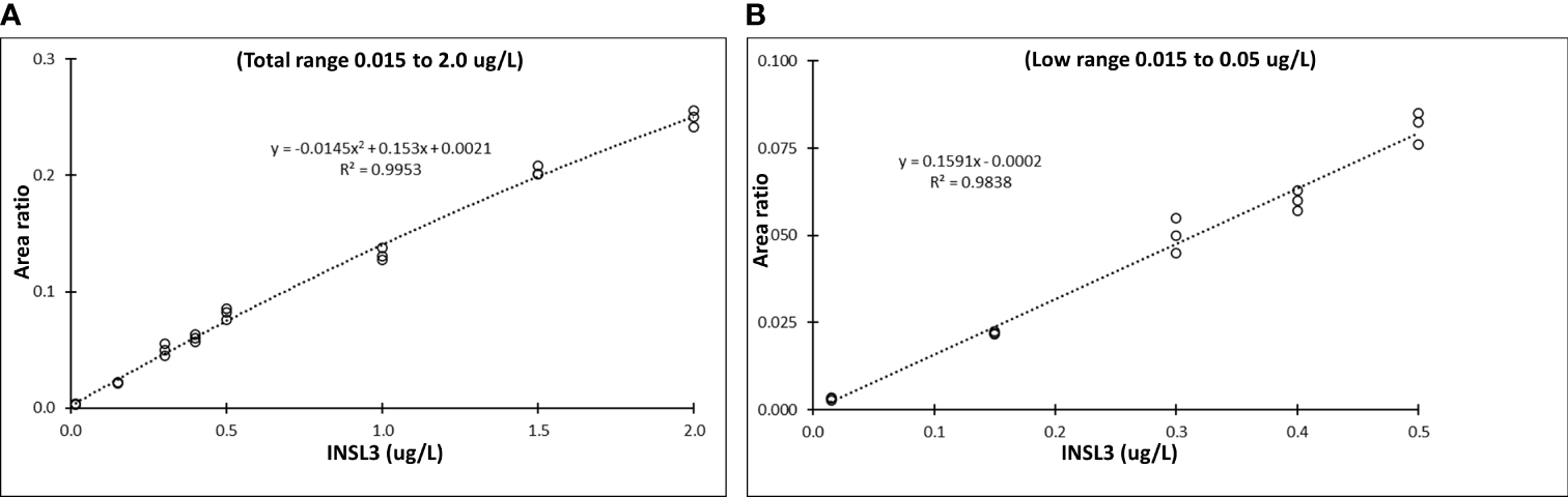 Sensitivity of serum INSL3 measurements with the TSQ Altis Plus Triple Quadrupole Mass Spectrometer (Thermo) (A) Nine-point calibration curve for serum INSL3 in the entire range from 0.015 to 2.0 ug/L with a quadratic fit. (B) Five-point calibration curve for serum INSL3 in the low range from 0.005 to 0.15 ug/L and with a linear fit.
