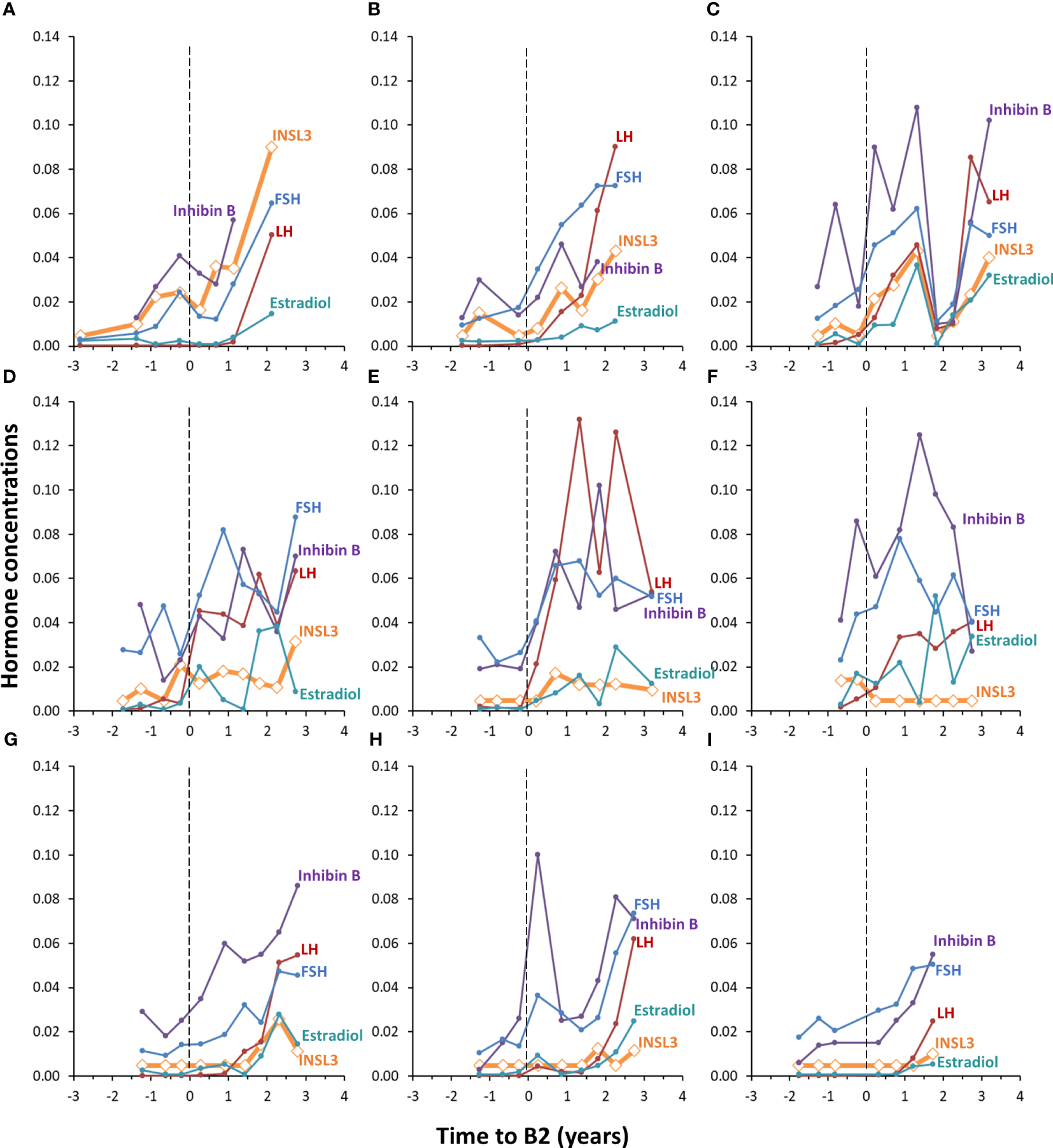 Individual longitudinal changes in serum INSL3 (orange), LH (red), FSH (blue), Inhibin B (purple) and estradiol (turquoise) during puberty in nine healthy girls (A–I). The y-axis represents the concentration of INSL3 (ug/L). The concentrations of the other four hormones are adjusted to fit in the same range; LH (I/U) is divided by 100, FSH (U/L) is divided by 100, Inhibin B is divided by 1000 and estradiol (pM) is divided by 10000. Pubertal onset is indicated by the dotted vertical lines (A–I).
