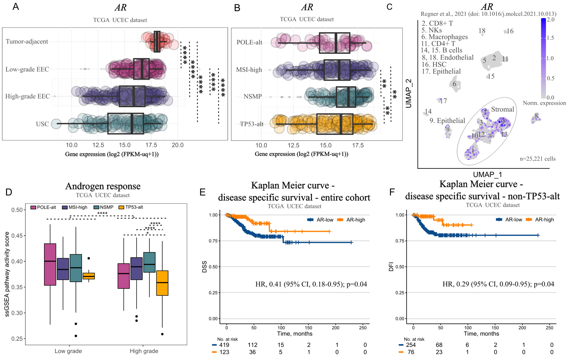 Androgen receptor (AR) signaling in endometrial tumors and its association with survival. (A) Boxplot illustrating AR expression in tumor-adjacent endometrial tissue (n=35), low-grade endometrioid EC (EEC) (n=215), high-grade EEC (n=194), and uterine serous carcinoma (USC) (n=113) from the TCGA UCEC cohort. (B) Boxplot illustrating AR expression in POLE-alt (n=48), MSI-high (n=142), NSMP (n=141), TP53-alt (n=151) tumors from the TCGA UCEC cohort. (C) 2D UMAP plot showing AR expression across different cell populations in endometrioid tumors (n=5) from Regner et al. (D) Boxplot showing androgen pathway activity in molecular subtypes of EC, stratified by grade (n=196 low-grade; from them: 17, POLE-alt, 63, MSI-high, 108, NSMP, 8, TP53-alt; n=286 high-grade; from them: 31, POLE-alt, 79, MSI-high, 33, NSMP, 143, TP53-alt) from the TCGA UCEC cohort. (E) Kaplan-Meier plot showing disease-specific survival (DSS) in patients with AR-high (n=123) vs AR-low tumors (n=419) from the TCGA UCEC cohort. (F) Kaplan-Meier plot showing DSS of patients with AR-high (n=76) vs AR-low non-TP53-alt tumors (n=254) from the TCGA UCEC cohort. Data is represented as boxplots showing median, 1st and 3rd quartiles, whiskers as min-max in (A, B, D) Significance levels: **p<0.01, ****p<0.0001 by Kruskal-Wallis followed by Dunn’s post hoc test with Bonferroni correction for A, B, D; univariate Cox proportional hazard model adjusted for grade in E-F. HSC, hematopoietic stem cells; NKs, natural killer cells.