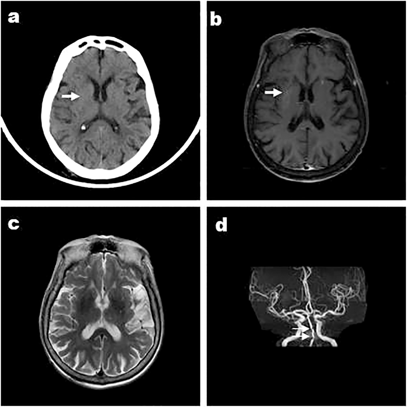 Case 3, a 66-year-old male, was admitted with “involuntary movement of the tongue and right limb for more than 1 month” and images showed bilateral striatum high density on CT (A), high signal on T1WI (B), iso-signal on T2WI (C), and MRA showed arterial stenosis (D). Arrows indicate bilateral striatum abnormal signal.
