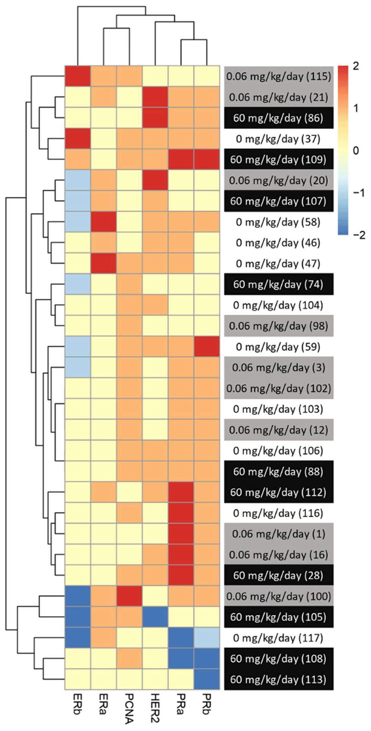 Visualization of clustered protein expression profile per pup. Clustered heatmap of markers for breast cancer subtype classification among the animals from different treatments (0, 0.06 and 60 mg/kg of body weight/day). Each line represents relative levels of the markers for each animal (identified by the numbers in brackets). The interval of protein expression of animals from the group exposed to 0 mg/kg of body weight/day and given oil by gavage at PND46 was considered as a for this heatmap. The graph was coded with the pheatmap Rstudio function (n = 10 pups, 1 per litter).