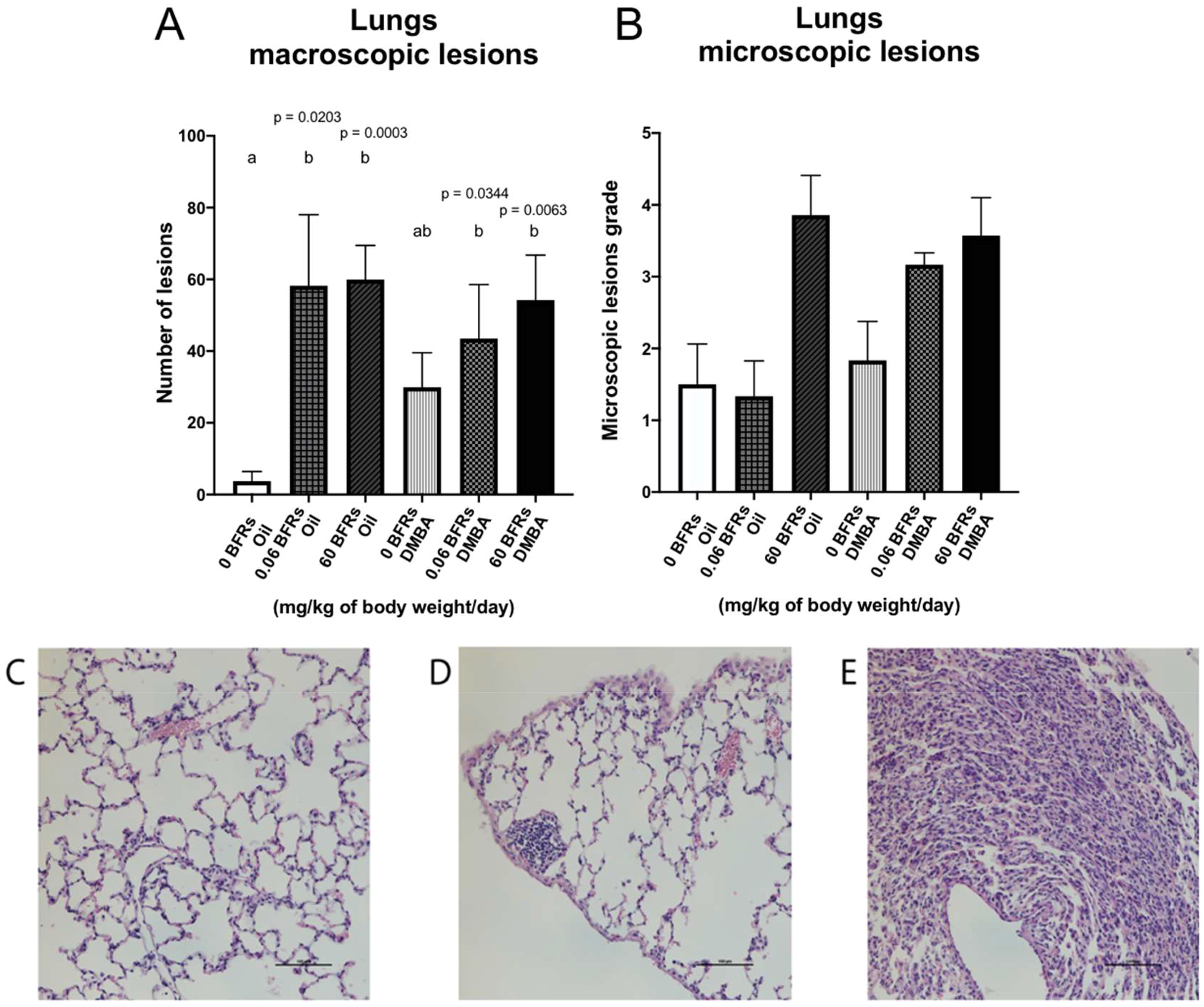 Representation of lung lesions after BFRs exposure in utero and through lactation. The animals exposed to BFRs showed macroscopic and microscopic lesions, resulting in a significant difference between BFRs-exposed and control groups for the macroscopic lesions (A, B). Quantitative analysis of microscopic lesions was done by giving a grade to each slide [0 normal tissue (C), 1 abnormal cell accumulation (D) and 3 = lesions (E)]. Histograms represent the means ± SEM (n ≥ 6 pups, 1 per litter). p-values were calculated with a Kruskal-Wallis statistical test or ANOVA. Variables are statistically indistinguishable if they share at least one letter. Scale = 100 µm.
