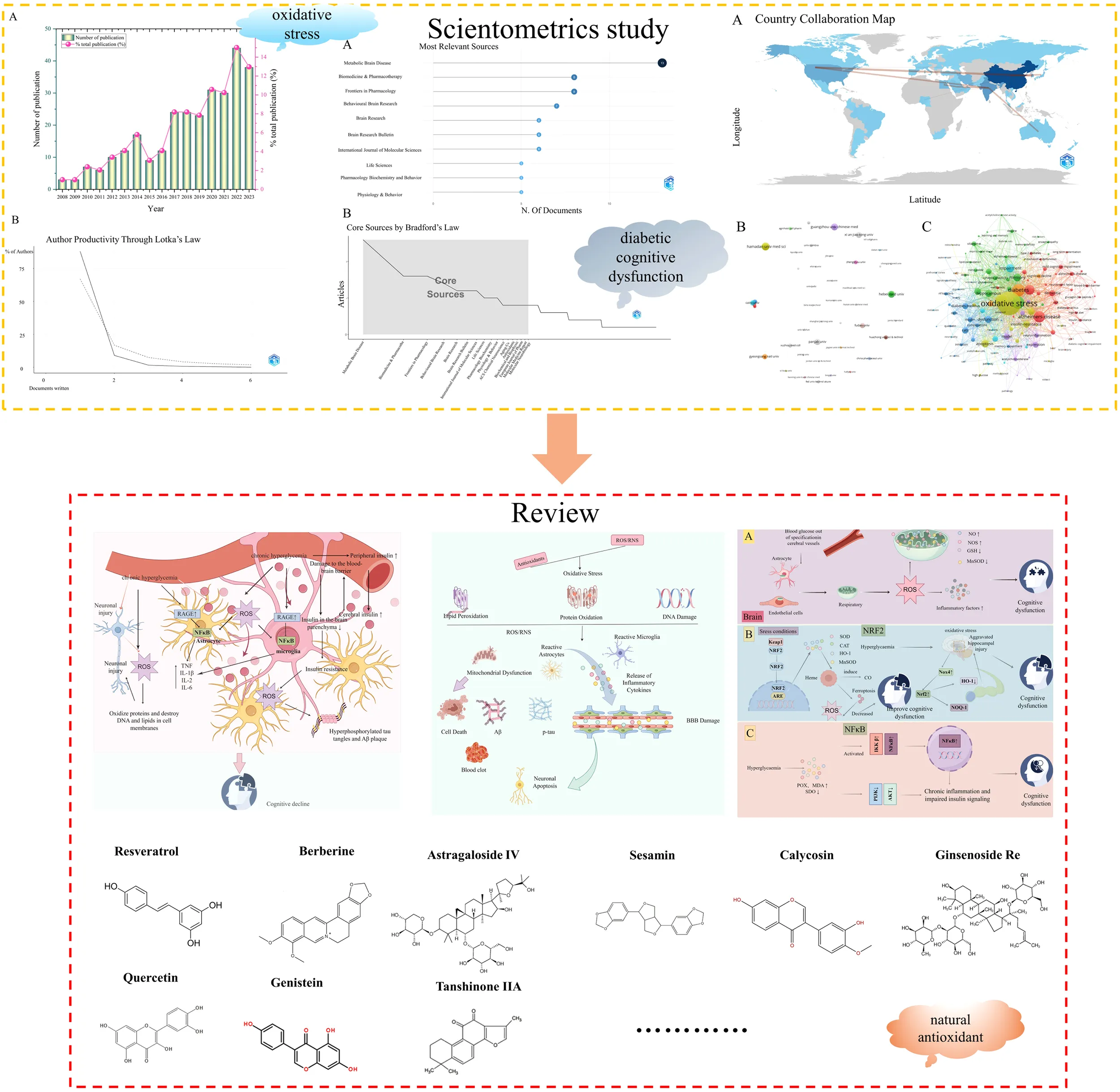 First, the Web of Science Core Collection was selected as the data source for a computerized literature search on oxidative stress and diabetic cognitive dysfunction (DCD). Next, Biblimetrix and VOSviewer performed statistical analysis focusing on publication countries, institutions, authors, research hotspots, and emerging directions in the field. Then, through the analysis of keywords and key articles, the forefront of the field is identified. Finally, we discussed the pathogenesis of DCD, the influence of oxidative stress on DCD and the antioxidant effect of natural products on DCD.