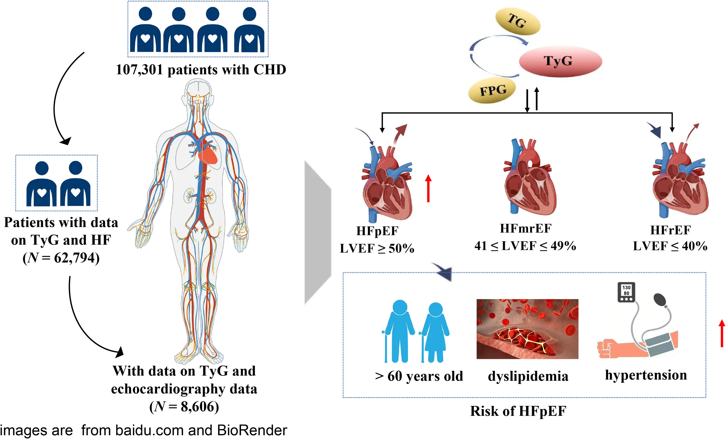 Therefore, this study aimed to clarify the association between the TyG index and HF in CHD patients and investigate the association between the TyG index and different types of HF, especially HFpEF. Identifying simpler biochemical indicators to prevent the risk of HF may aid in the clinical management of CHD.