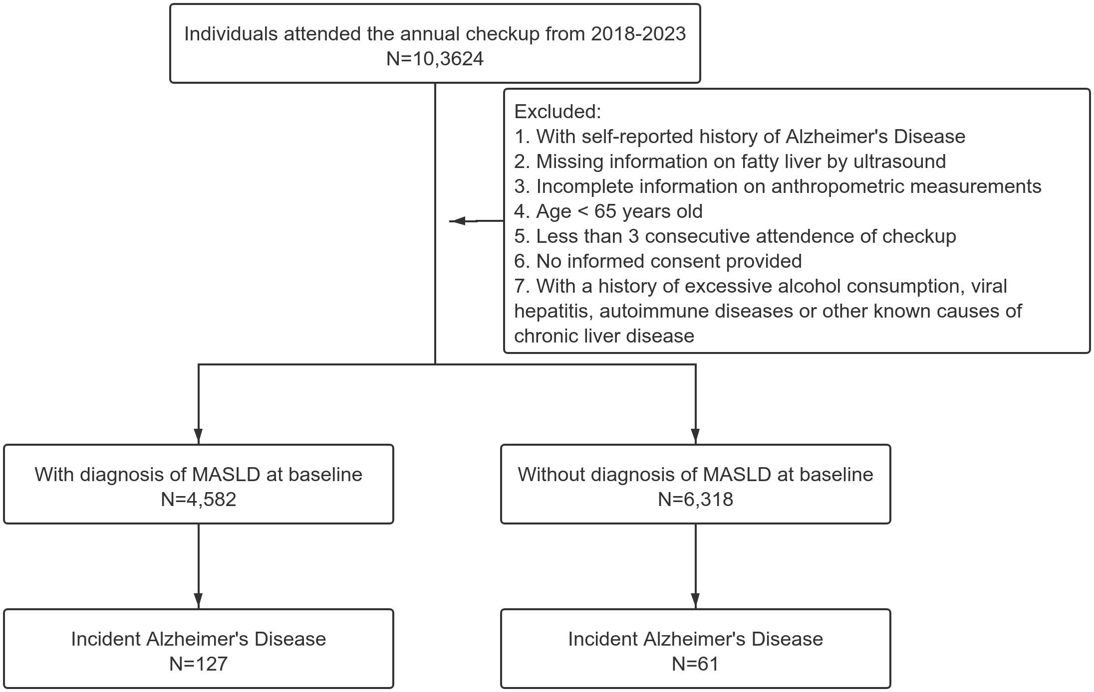 The dataset comprised individuals who underwent routine health check-ups between January 2018 and June 2023. As AD has a high prevalence among elderly individuals, we only selected those with age over 65 years old in this analysis. Other inclusion criteria for the study were individuals with complete records, including demographic details, clinical measurements, and laboratory test results. Patients with a history of excessive alcohol consumption, viral hepatitis, autoimmune diseases or other known causes of chronic liver disease were excluded from the study to isolate the impact of MASLD (see flow chart in Figure 1). No participants received anticholinergic drugs in our dataset. All individuals will sign the informed consent when checking in annually.