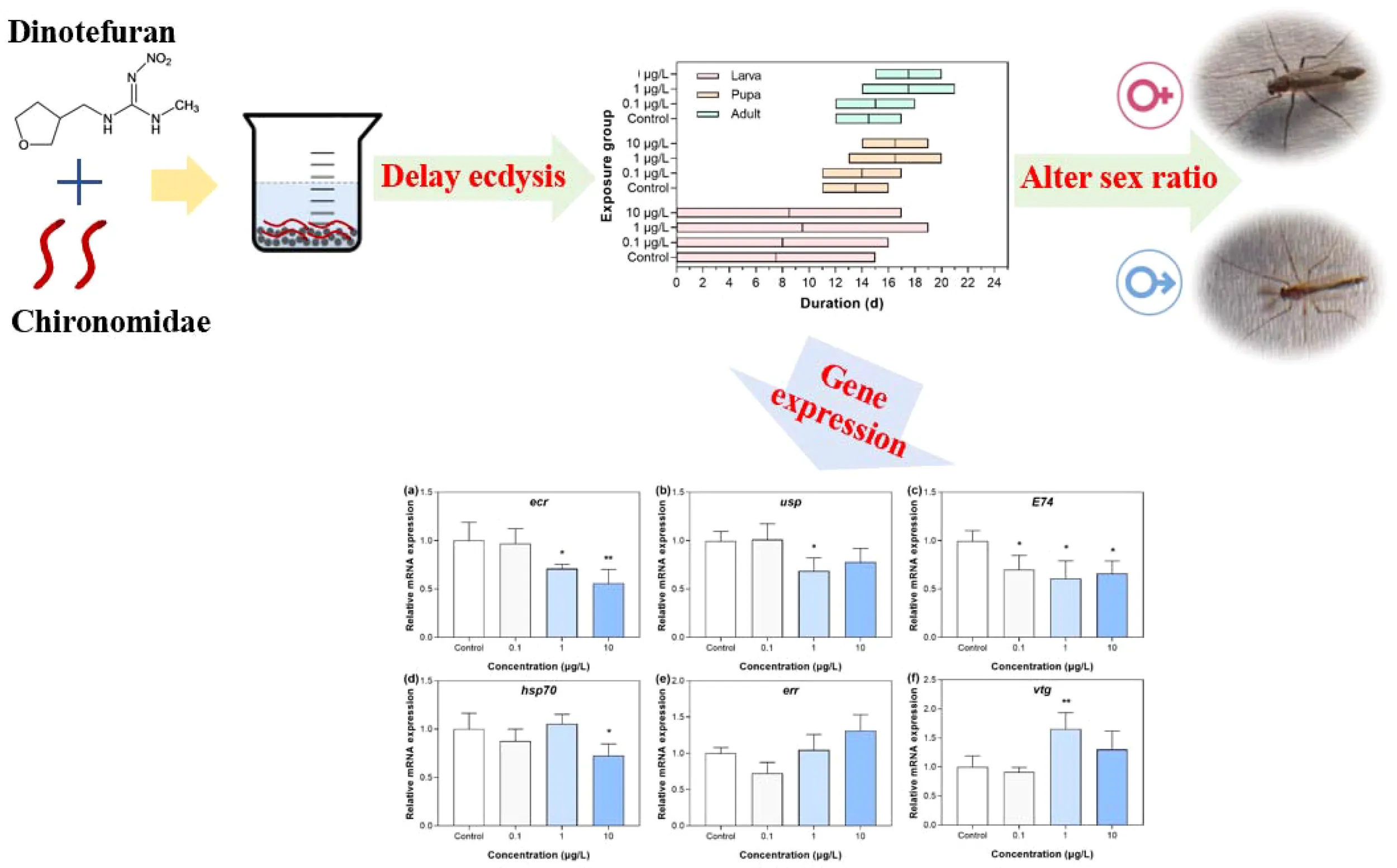 In the present study, the endocrine-disrupting effects of representative neonicotinoid dinotefuran on Chironomus kiinensis were investigated at different environmental concentrations by long-term exposure. Ecdysis and sex ratio, along with relevant gene expressions, were measured. These results would improve our understanding of the endocrine-disrupting mechanisms of neonicotinoid insecticides to Chironomidae and provide data support for assessing their potential environmental risks.