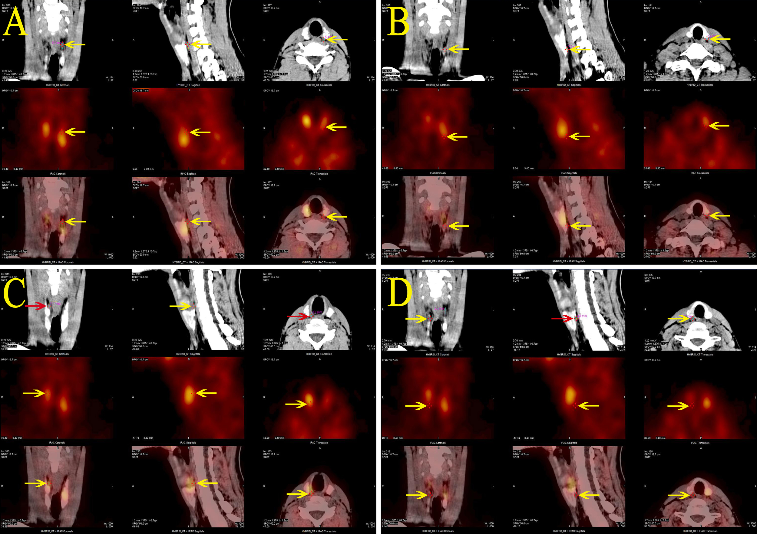 Calcium, phosphate, and PTH levels were normal during the hospital stay. But during follow-up, elevated blood calcium, PTH levels, and decreased phosphate levels were observed. Blood calcium levels were monitored at 2.62-2.81 mmol/L (normal range 2.1-2.7 mmol/L), phosphate at 1.07-1.33 mmol/L (normal range 0.81-1.45 mmol/L), and PTH at 9.85-11.35 pmol/L (normal range 1.60-6.90 pmol/L), with a 24-hour urinary calcium excretion of 12.94 mmol/24h (normal range 2.5-7.5) and urinary phosphate of 27.0 mmol/24h (normal range 22-48). Bone metabolism markers indicated a significant increase in bone turnover. The patient experienced no symptoms of polydipsia, polyuria, nausea, vomiting, abdominal pain, back pain, hematuria, or bone pain. Parathyroid ultrasound revealed: bilateral deep parathyroid solid nodules. Parathyroid single photon emission computed tomography/computed tomography (SPECT/CT) hybrid Imaging: four parathyroid glands were visualized, and there was no significant increase in parathyroid technetium-99m methoxyisobutylisonitrile (99mTc-MIBI) scan uptake (Figure 2).