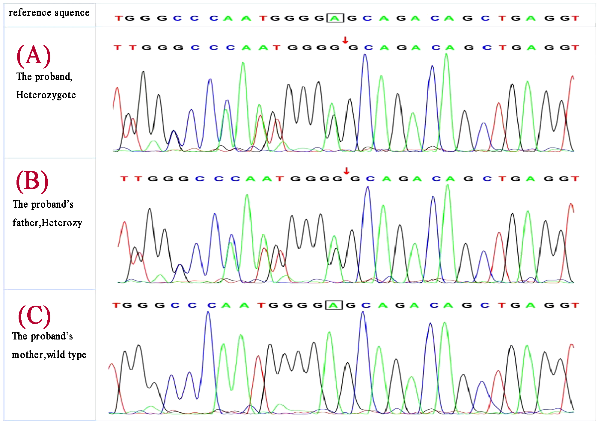 Deepened whole-exome sequencing identified a genetic variant c.587delA on chromosome 11 (chr11:64575445) in the proband (A), the proband’s father carried the same gene change (B) ,and the mother was wild type (C).