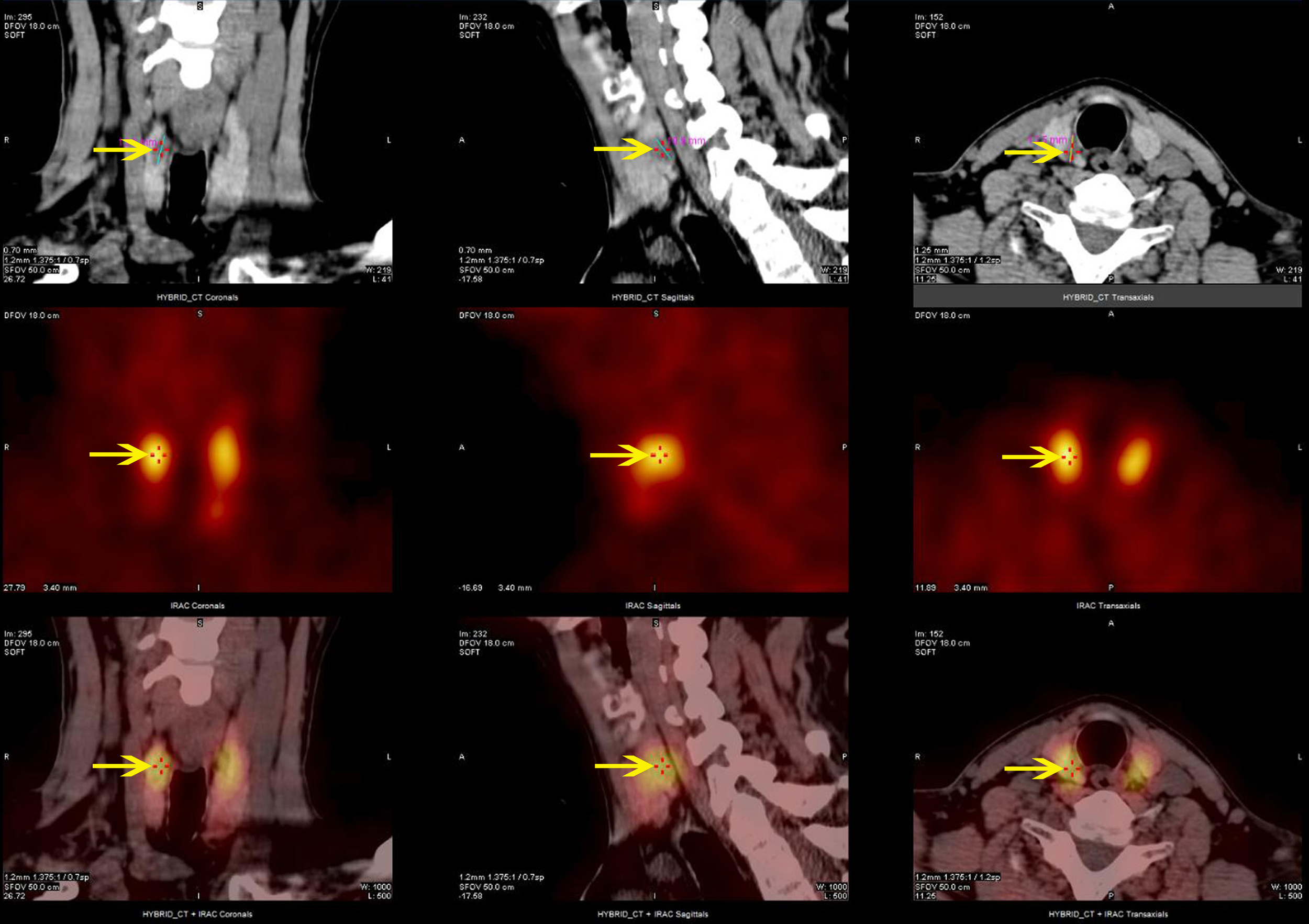 Parathyroid SPECT/CT hybrid imaging of the proband’s father: nodular parathyroid imaging is observed in the posterior aspect of the lower pole of the right thyroid lobe, with mildly increased MIBI uptake.