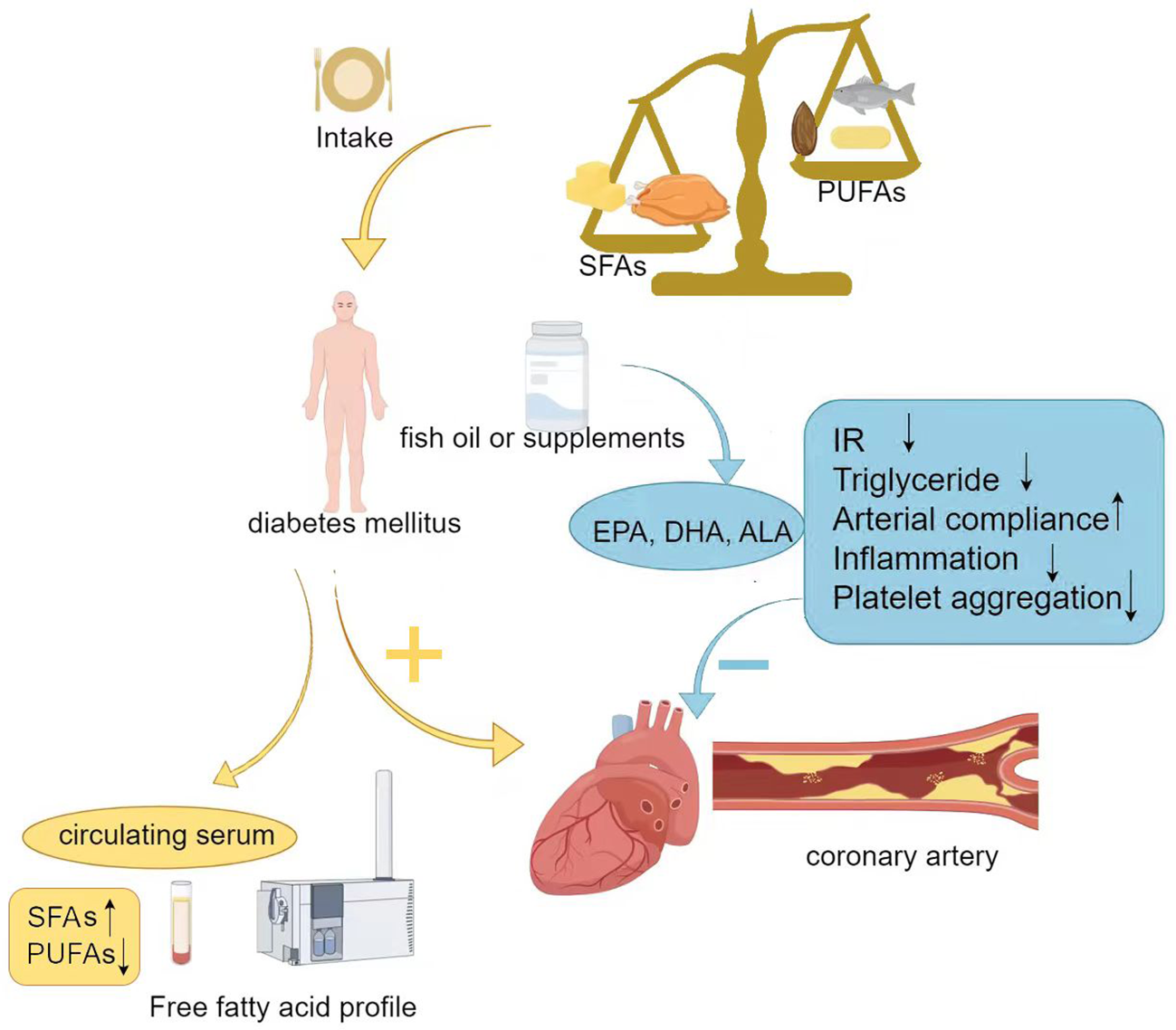 FFA is an important energy substrate for the human body and is involved in many metabolic regulations (10). FFA mainly originates from adipose tissue, released through the breakdown of triglycerides, and is primarily carried in the blood by serum albumin (11). FFA includes saturated fatty acids (SFAs) and unsaturated fatty acids (UFAs), with the latter further divided into monounsaturated fatty acids (MUFAs) and polyunsaturated fatty acids (PUFAs). They perform different functions due to their structural differences. The FFA profile can be regarded as a collective term for different types of FFAs. An important analytical method for detecting and analyzing the FFA profile is liquid chromatography-tandem mass spectrometry (LC-MS/MS), which has advantages over traditional immunoassays and spectroscopic methods in terms of high throughput, high accuracy, high sensitivity, and high specificity. FFA level is associated with insulin resistance and the development of diabetes mellitus (12–14). Higher FFA level can predict the occurrence and severity of atherosclerotic plaques in patients with T2DM (15–19), and may also be related to the prognosis of patients with coronary heart disease (20). Previous studies on the atherosclerosis risk in diabetic patients have focused more on the total level of FFA, but there is less research on the specific composition and concentration changes of FFAs. Circulating FFA concentrations depend not only on dietary intake but also on endogenous synthesis and metabolism. Estimating individual FFA quality intake through dietary assessment is relatively difficult, and measuring circulating FFAs as biomarkers is considered more reliable compared to self-reported assessments of fatty acid intake (104). In recent years, with further research and advancements in testing technology, the FFA profile has attracted widespread attention. The FFA profile contains many different types of FFAs. The total plasma FFA level in patients with T2DM are often elevated, with the most commonly observed increase in their FFA profile being SFA (especially palmitic acid, C16:0) (21). C16:0 is the most abundant fatty acid in the human body, and its abnormal increase within cells can weaken insulin signaling, leading to the development of insulin resistance (22). Insulin resistance alters systemic lipid metabolism, resulting in high levels of triglycerides, low levels of high-density lipoprotein, and the presence of small, dense low-density lipoproteins. These lipid changes, along with endothelial dysfunction induced by abnormal insulin signaling, contribute to the formation of atherosclerotic plaques (23). Although the exact mechanisms behind the changes in blood FFA profiles in diabetic patients are not yet clear, it is believed that they may be related to changes in dietary fats and lipid metabolism (24). Some FFAs have shown potential in predicting cardiovascular complications in T2DM and are associated with the severity of these complications. Here, we aim to review the changes in the FFA profile in T2DM and discuss the relationship between the FFA profile and the occurrence of vascular complications in T2DM.