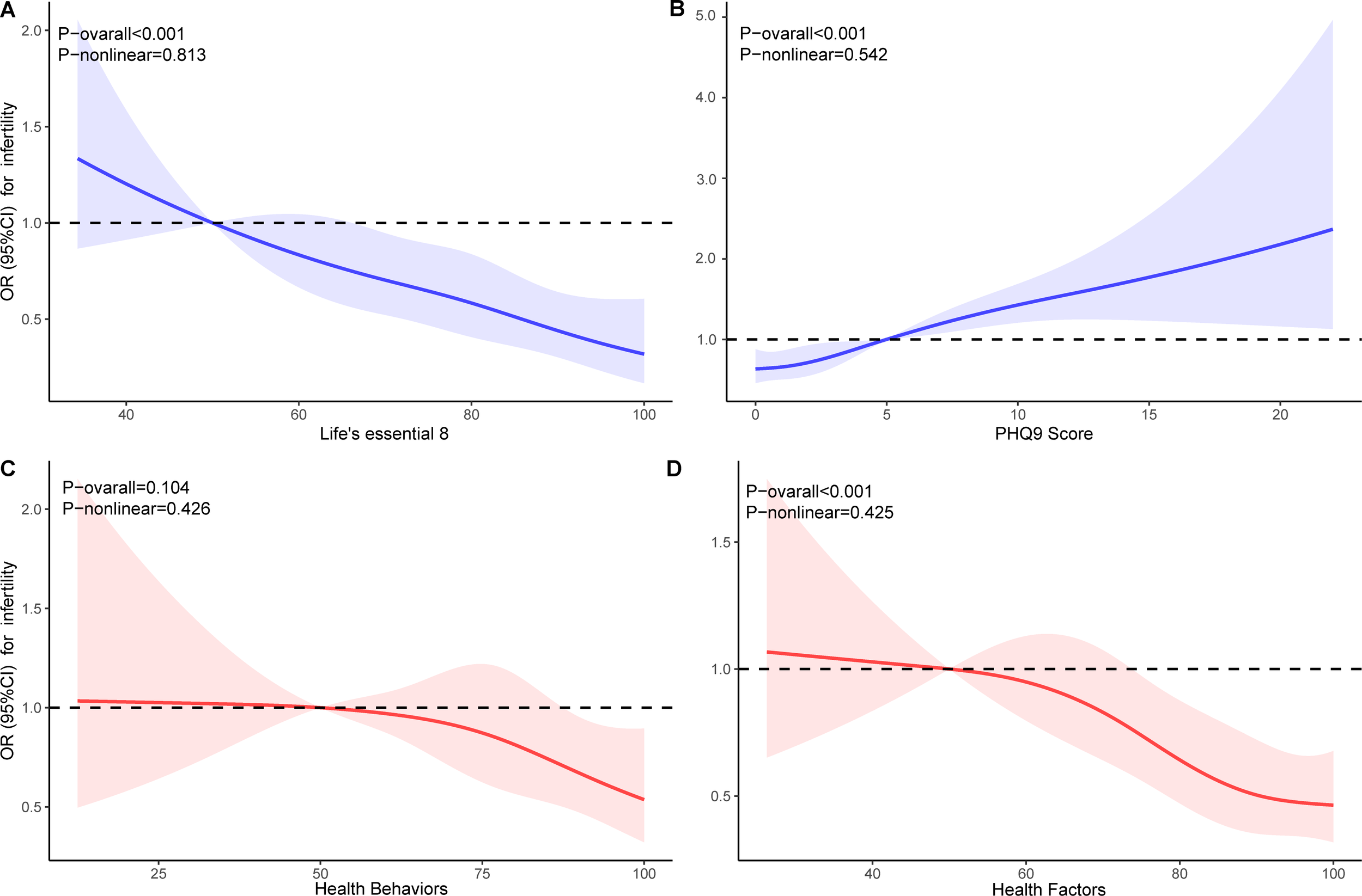 Weighted multifactorial logistic regression models were constructed to investigate the association between CVH, HBS, HFS, depressive state, and infertility. To explore potential nonlinear relationships, weighted restricted cubic spline (RCS) regression models were employed. Likelihood ratio test was used to test nonlinearity. The number of nodes was determined based on the lowest value of the Akaike information criterion (AIC).Subgroup analyses were conducted based on race, education level, age, household income, and marital status, with interactions assessed via likelihood ratio tests.
