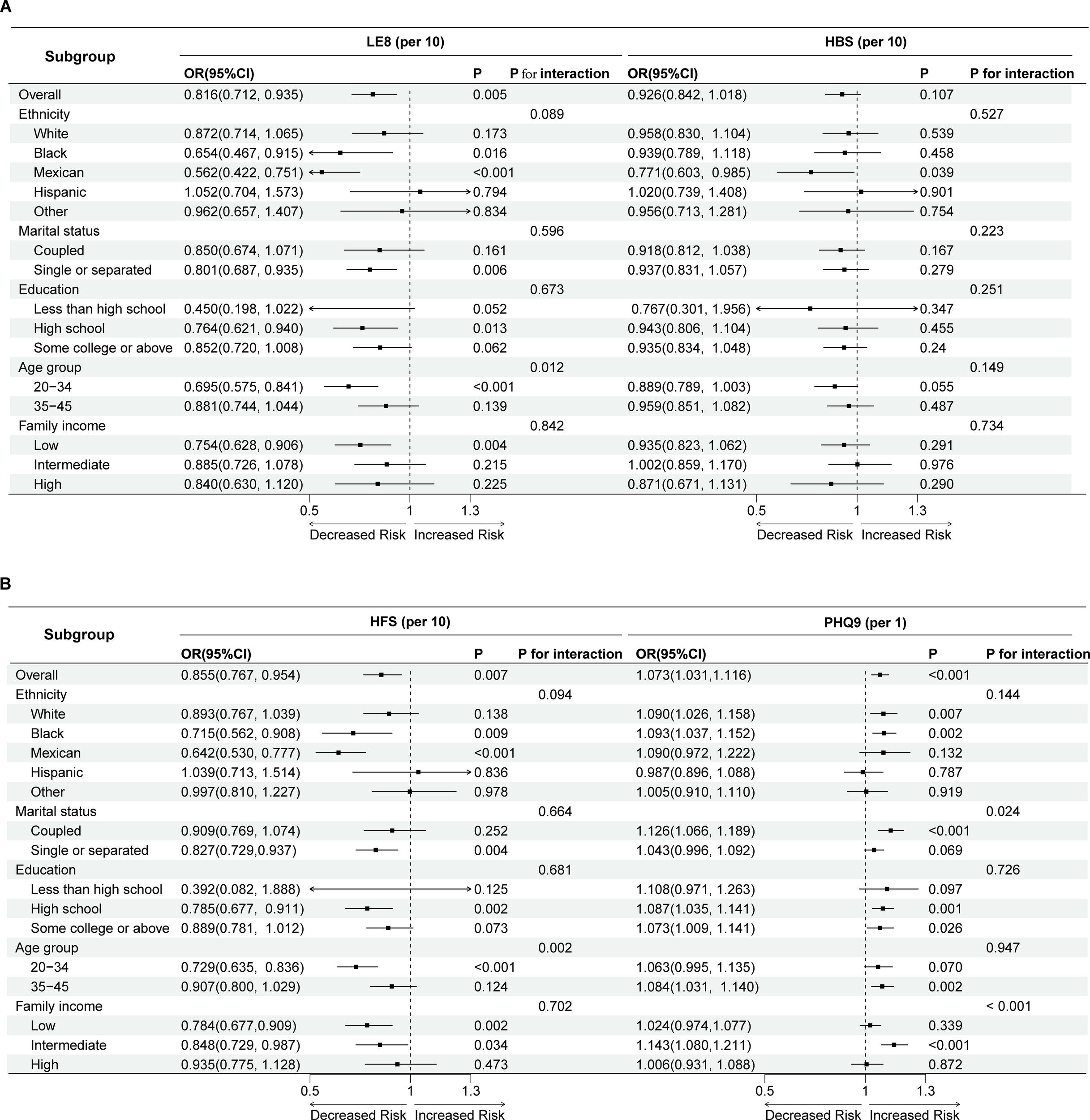 The results of multifactorial logistic regression analysis revealed a significant negative association between the HFS within LE8 and infertility (p=0.004), both overall and in the BMI score(p=0.002) and blood glucose score(p=0.030) subgroups. The OR and 95% CI for each 10-point increase in HFS was 0.855 (0.767, 0.954). This indicates that higher cardiovascular fitness, as reflected in higher LE8 scores and increased levels of healthy physical activity, may mitigate the risk of infertility. Conversely, the association between the HBS score and infertility did not reach statistical significance (p=0.077). Furthermore, scores for sleep health, BMI, and blood glucose were significant negative correlations with infertility. In contrast, there was a notable positive correlation observed between depressive symptoms, as measured by PHQ-9 scale scores, and infertility (p<0.001), with an OR and 95% CI of 1.073 (1.031,1.116) for each point increase in PHQ-9, indicating that individuals reporting higher levels of depression symptoms are more prone to infertility (Table 2, Supplementary Table S2).