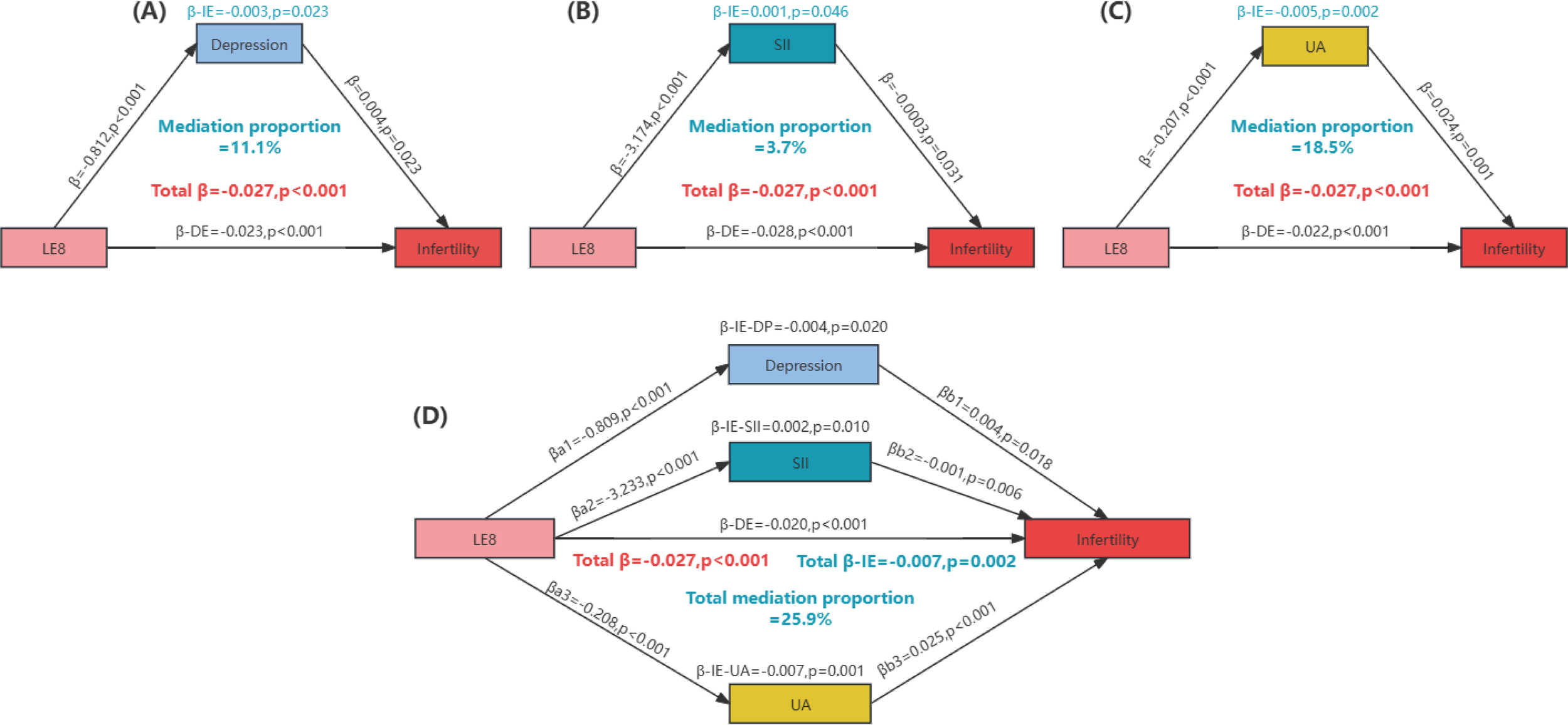 Mediation analyses were performed to evaluate the mediating effect of LE8 scores on infertility, considering depression (PHQ-9), oxidative stress (UA), and inflammation (SII) variables. We used a similar approach to assess the relationships between LE8 and PHQ-9, UA, and SII, as well as the relationships among PHQ-9, UA, SII, and infertility. The R packages ‘mediator’ and ‘lavaan’ were employed to estimate the independent and joint mediating effects of SII, UA, and PHQ-9, respectively. A total of 5,000 replicate simulations were conducted to obtain more accurate estimates of the mediating effects and their confidence intervals. The results included the effect (β), indirect effect (βindirect, β-IE), direct effect (βdirect, β-DE), total effect (Total β), and p-values. Mediation effects were analyzed based on LE8 scores (per 10-point increase).
