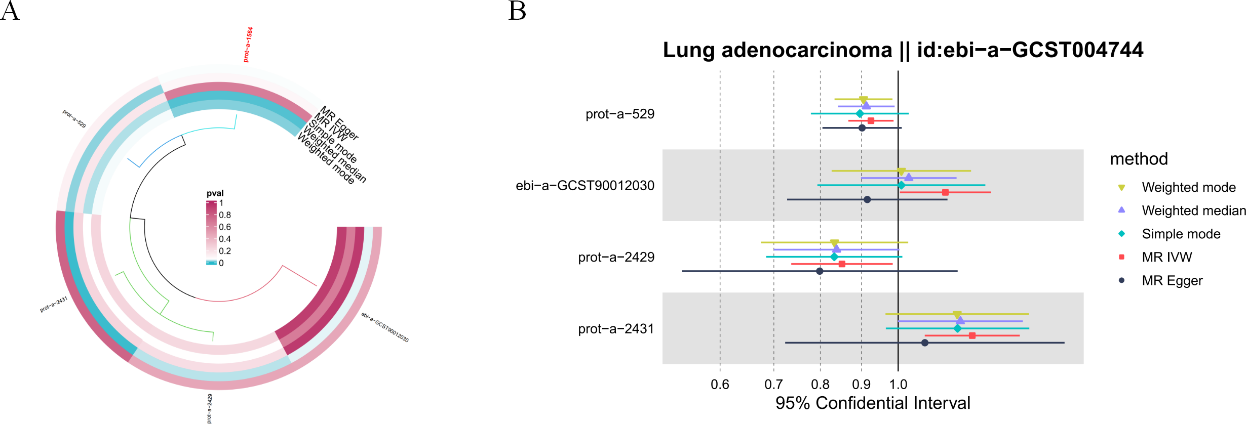 Sensitivity analysis results of hormone levels and LUAD. (A) Circular plot for the sensitivity analysis of hormone levels and LUAD. (B) The sensitivity analysis results of hormone levels and LUAD include weighted median, MR Egger, and IVW.