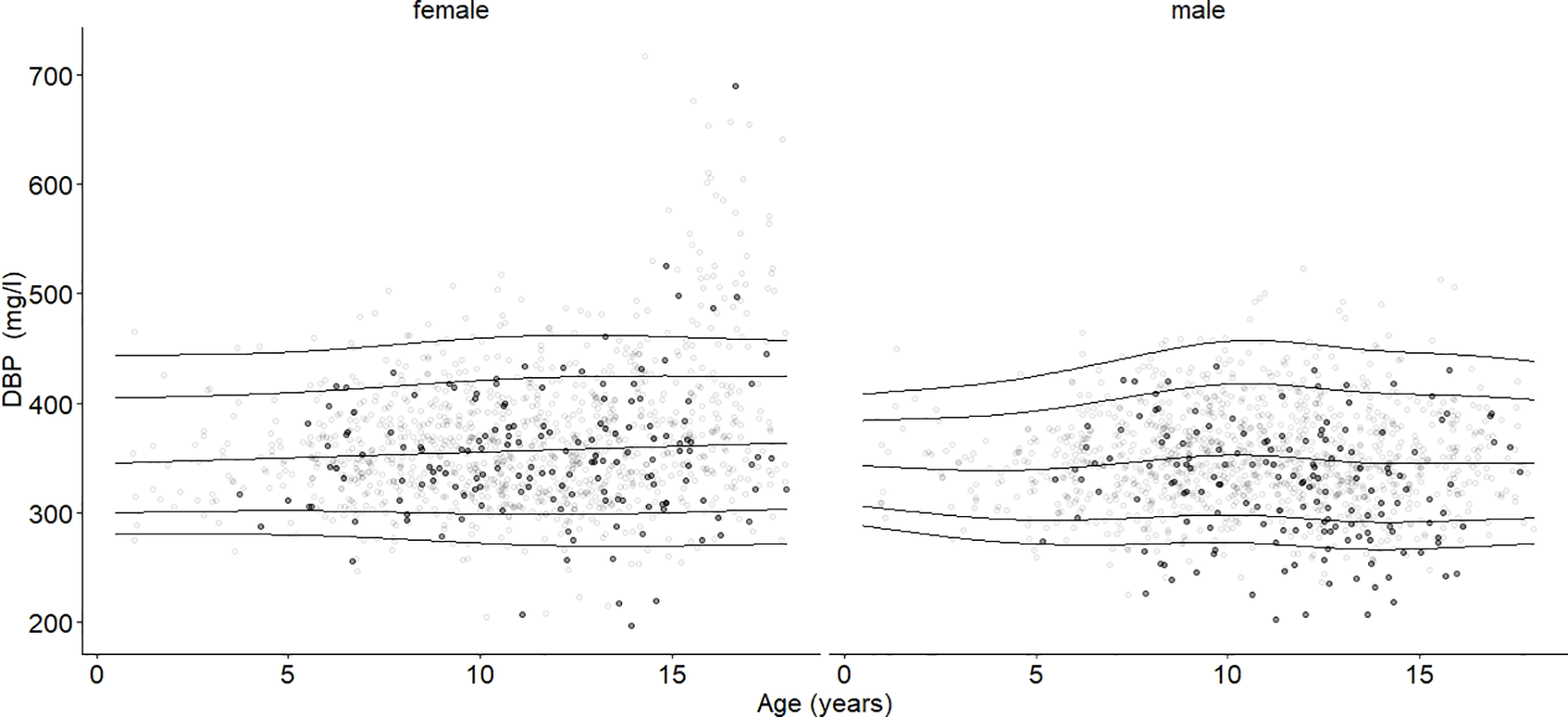 Mean DBP values differed between males (347 mg/l) and females (366 mg/l) (p < 0.001). Age had no significant association with DBP levels. In both males and females, DBP levels remained relatively stable from infancy through late adolescence. Children and adolescents with obesity had lower mean DBP levels compared with normal-weight subjects (ß = -14.28, p < 0.001). The BMI-SDS was inversely associated with DBP levels in males (ß = -5.7, p < 0.001). Female subjects using oral contraceptives had higher levels of DBP (ß = 141.38, p < 0.001). DBP was positively associated with the vitamin D metabolites: 25(OH)D3 (females: ß = 0.8, p < 0.001; males: ß = 1.2, p < 0.001) and 1,25(OH)2-D3 (females: ß = 0.3, p < 0.001; males: ß = 0.4, p < 0.001). An inverse association between osteocalcin and DBP (females: ß = -0.1, p < 0.022; males: ß = -0.1, p = 0.027) was found. CRP levels were also positively associated with DBP levels (females: ß = 2.8, p = 0.001; males: ß = 5.1, p < 0.001).