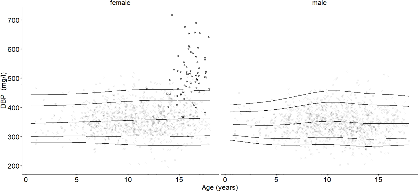Age- and sex-adjusted 2.5th, 10th, 50th (median), 90th, and 97.5th percentiles for DBP (mg/l) for the reference cohort, subjects in the study cohort (grey dots), and subjects with oral contraceptive use (black dots). Subjects using oral contraceptives had increased DBP blood levels (p < 0.001).