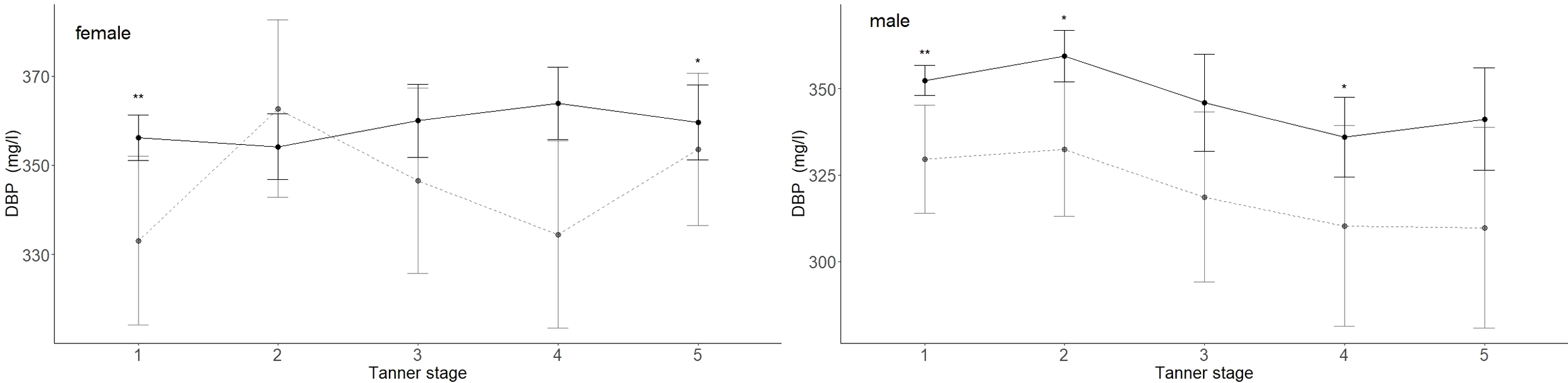 DBP (mg/l) values for children and adolescents from the reference (black lined) and obese cohorts (grey dashed line) are shown by Tanner stages. Females taking contraceptive drugs were excluded from this analysis. The 95% confidence intervals are represented by vertical lines. The numbers are indicated in Supplementary Table S2. Mean DBP levels in obese males were significantly lower in Tanner stages 1, 2, and 4 and significantly lower in females in Tanner stages 1 and 5. p-values: p = significance codes: < 0.01 “**”, < 0.05 “*”.