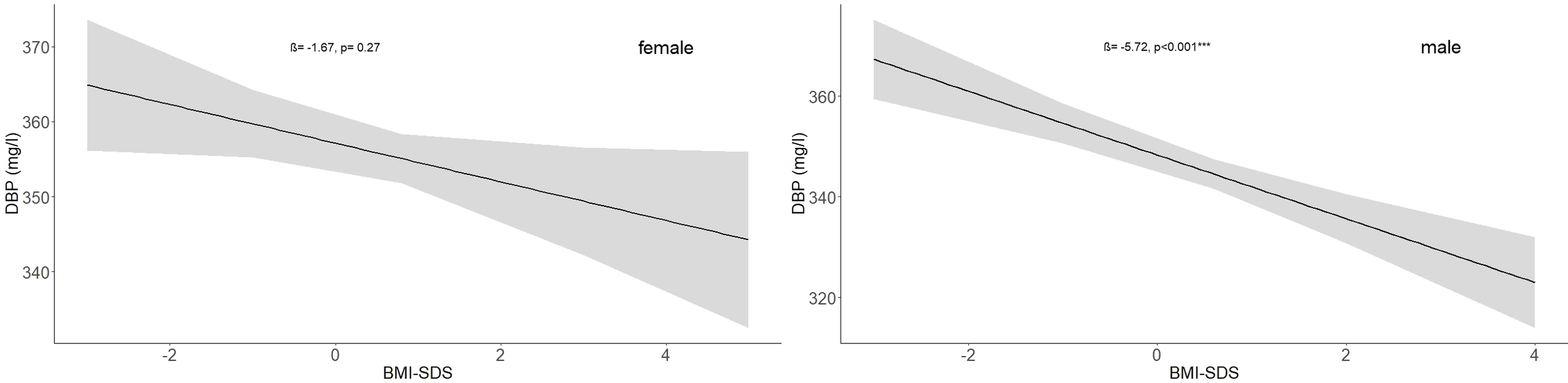In the study cohort (1716 subjects and 2503 samples) DBP was inversely associated with BMI-SDS, but the association was statistically significant only in males (p < 0.001). While an increase in BMI-SDS of +1 showed a decrease of 5.72 mg/l in the DBP serum concentration in males, it decreased by only 1.67 mg/l in females (Table 3, Figure 5). DBP values in the group with obesity were significantly lower than DBP in the reference group, age-adjusted and independent of sex (ß = -14.28, p < 0.001). These findings are illustrated in Figure 2. Males with obesity (159 samples from 130 subjects) had significantly lower DBP levels than their reference weight peers (1081 samples from 742 subjects) in Tanner stages 1, 2, and 4. Similarly, females with obesity (158 samples from 123 subjects) had significantly lower levels in Tanner stages 1 and 5 than their reference group (986 samples from 672 subjects) (Figure 4; Supplementary Table S2).