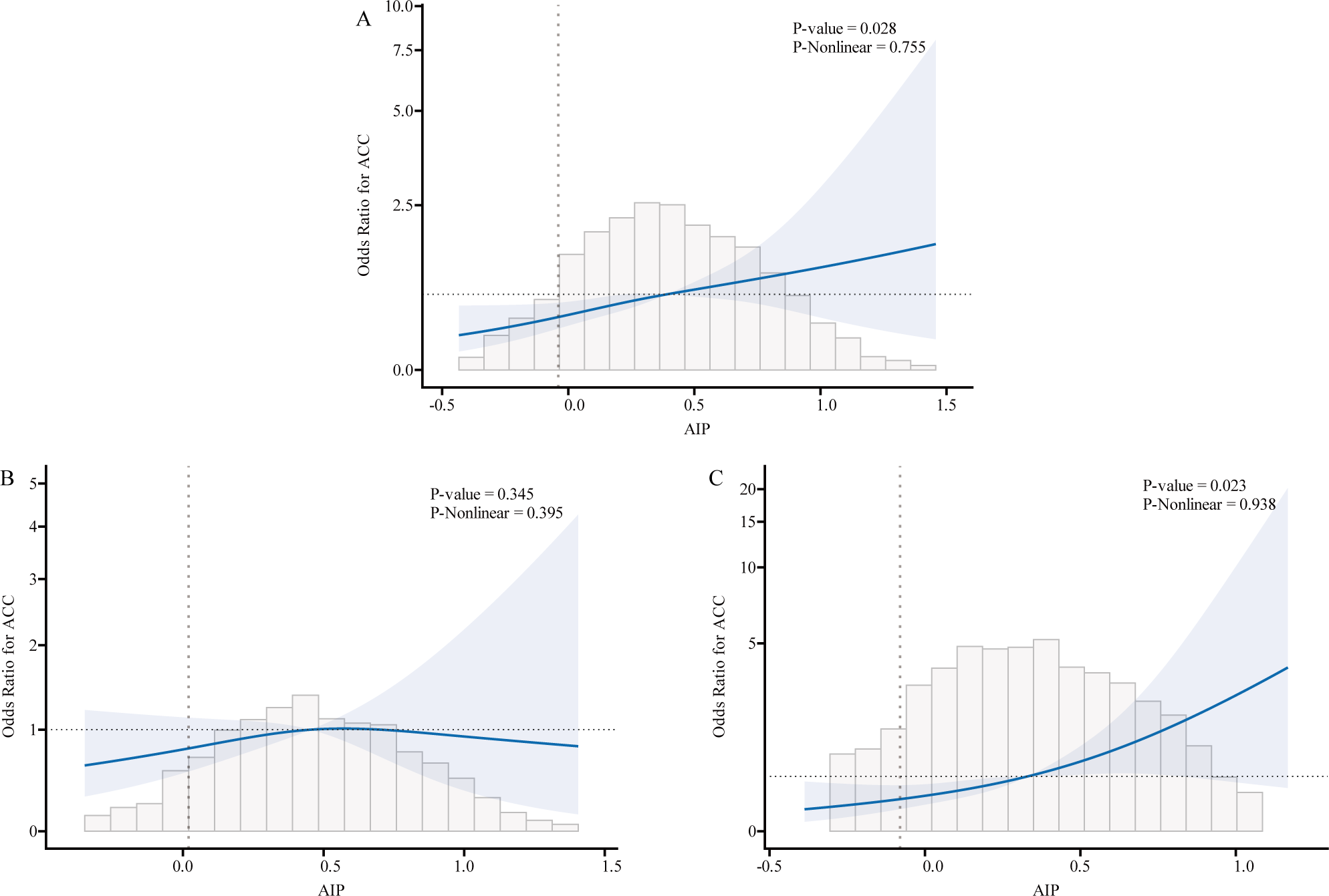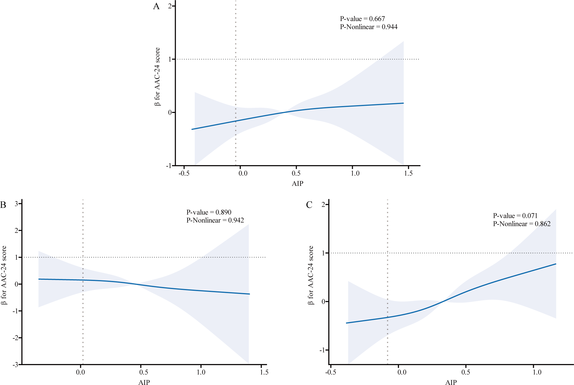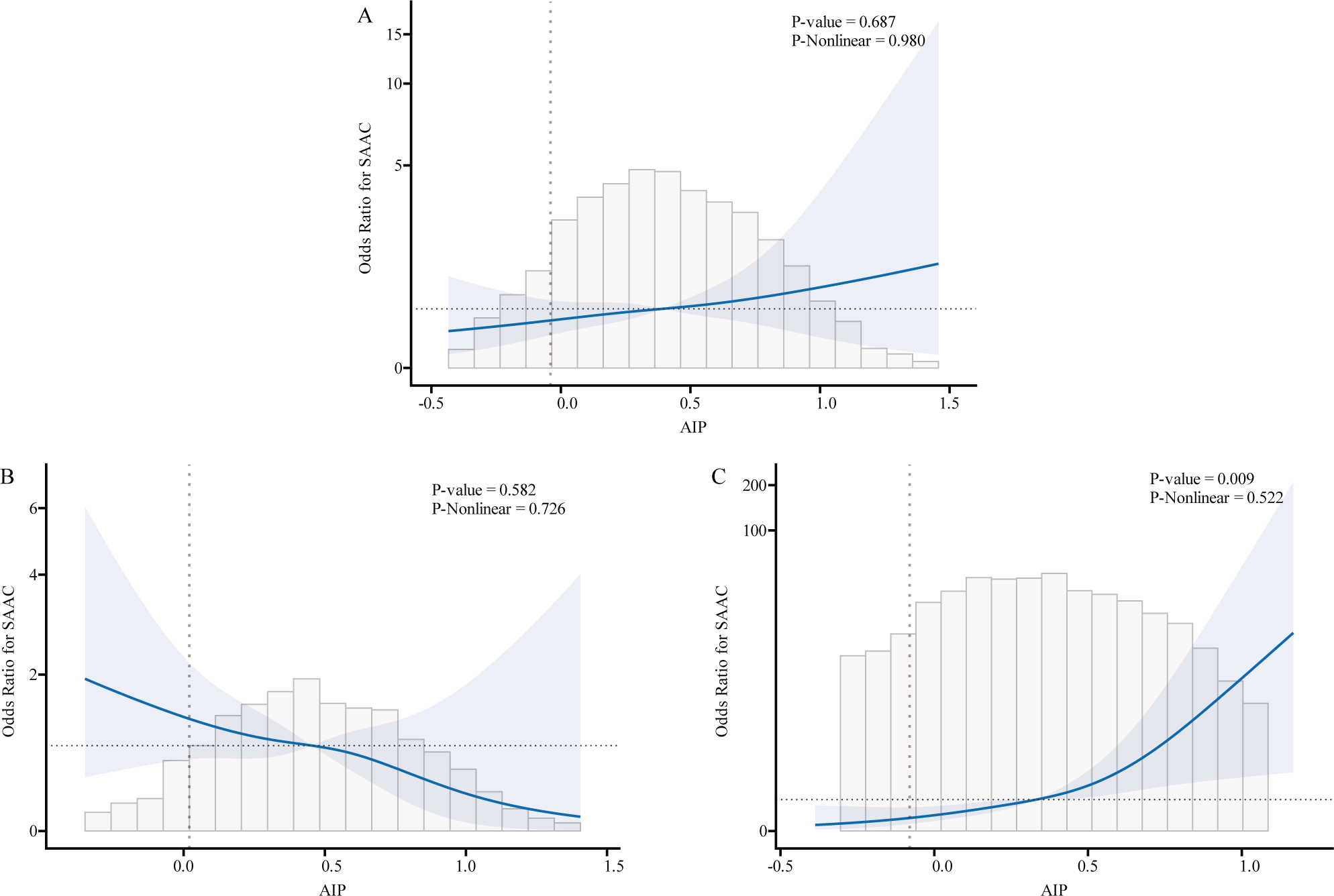 The VIFs for all covariates included in the multivariable regression models were calculated to assess potential collinearity. The VIF values for all variables were below 10, with the highest being 5.8 for waist circumference (Supplementary Table S1). This indicates that no significant multicollinearity was present among the selected variables, and all selected covariates were retained for the final analysis. Among all participants, AIP showed a strong positive association with AAC, with each 1% increase in AIP linked to a 31% (OR = 1.31, 95% CI: 1.05–1.64) and 144% (OR = 2.44, 95% CI: 1.38–4.32) increase in AAC risk in unadjusted and fully adjusted models, respectively. Quartile analyses confirmed this trend, with participants in higher AIP quartiles exhibiting significantly elevated AAC risks compared to Q1 (p for trend < 0.003). However, multivariable linear analysis revealed no significant difference between AIP and AAC-24 score or the risk of SAAC after adjusting for covariates (Table 2).