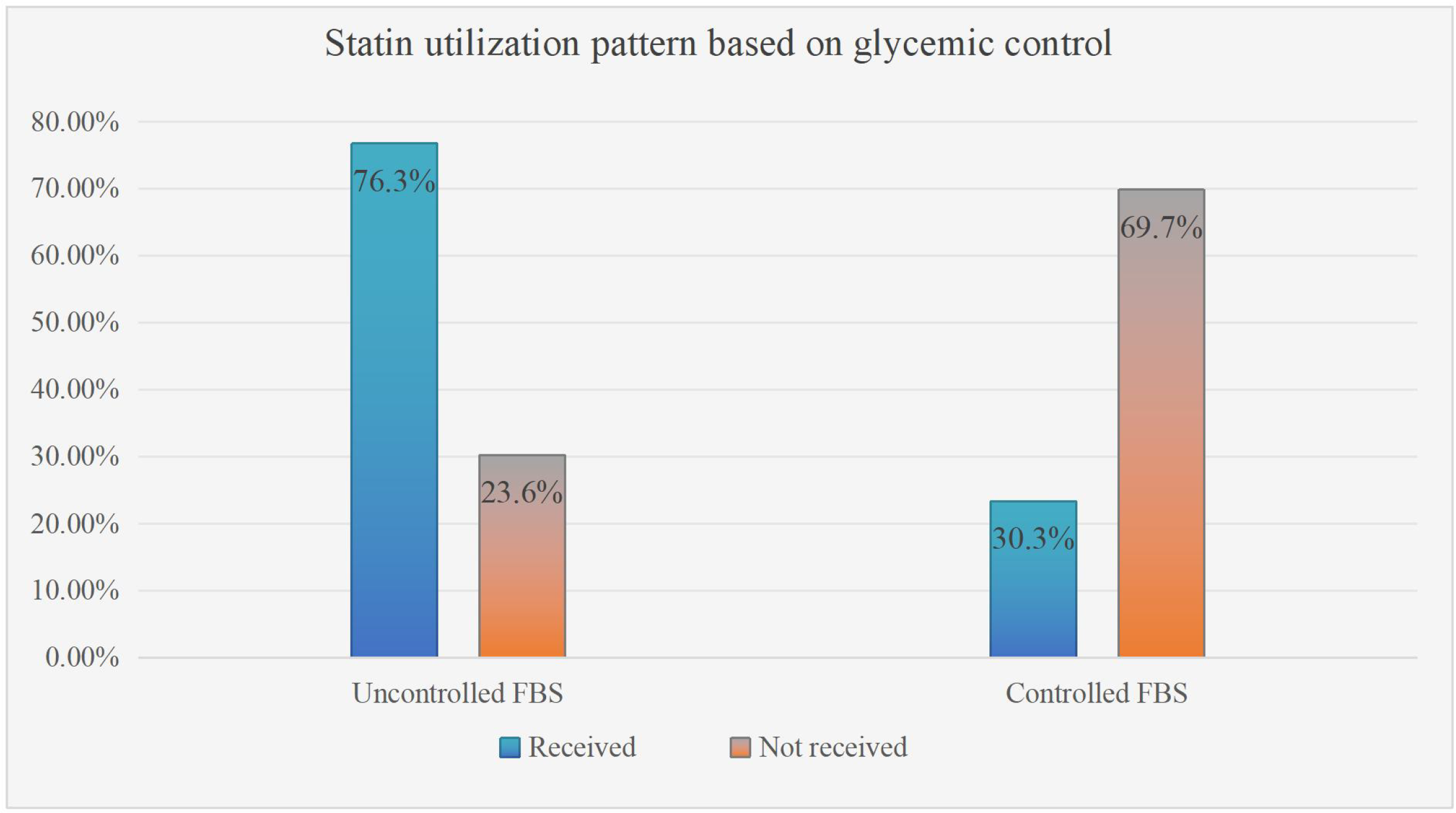 A hospital-based cross-sectional study was carried out among 351 diabetic patients at Arsi Teaching and Referral Hospital (ARTH) between February and September 2022. Participants were selected using a systematic random sampling method. Data were collected through a pretested, interviewer-administered structured questionnaire and a checklist. Trained nurses from the diabetic clinic conducted data collection. The collected data were initially entered into Epi Data version 7.2, then exported to SPSS version 26 (IBM, USA) for analysis. The association between statin use and potential predictors was examined using odds ratios (ORs) with 95% confidence intervals (CIs). Variables with a p-value below 0.05 in the multivariable logistic regression were considered statistically significant.