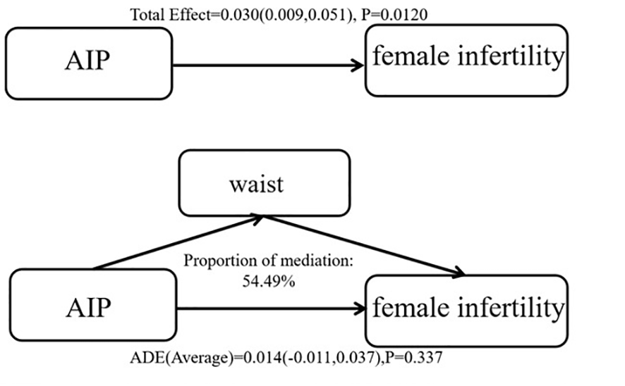 Previous studies have identified WC as a contributing factor to infertility (21–23). Additionally, prior researches have indicated strong correlations between AIP and WC (24–26). Nevertheless, the interaction between them remains thoroughly unexplored. Exploring the mediating role of WC could offer valuable insights into the mechanisms by which AIP impacts the risk of infertility, potentially uncovering new avenues for intervention. This could lead to more targeted interventions, ultimately improving infertility prevention.