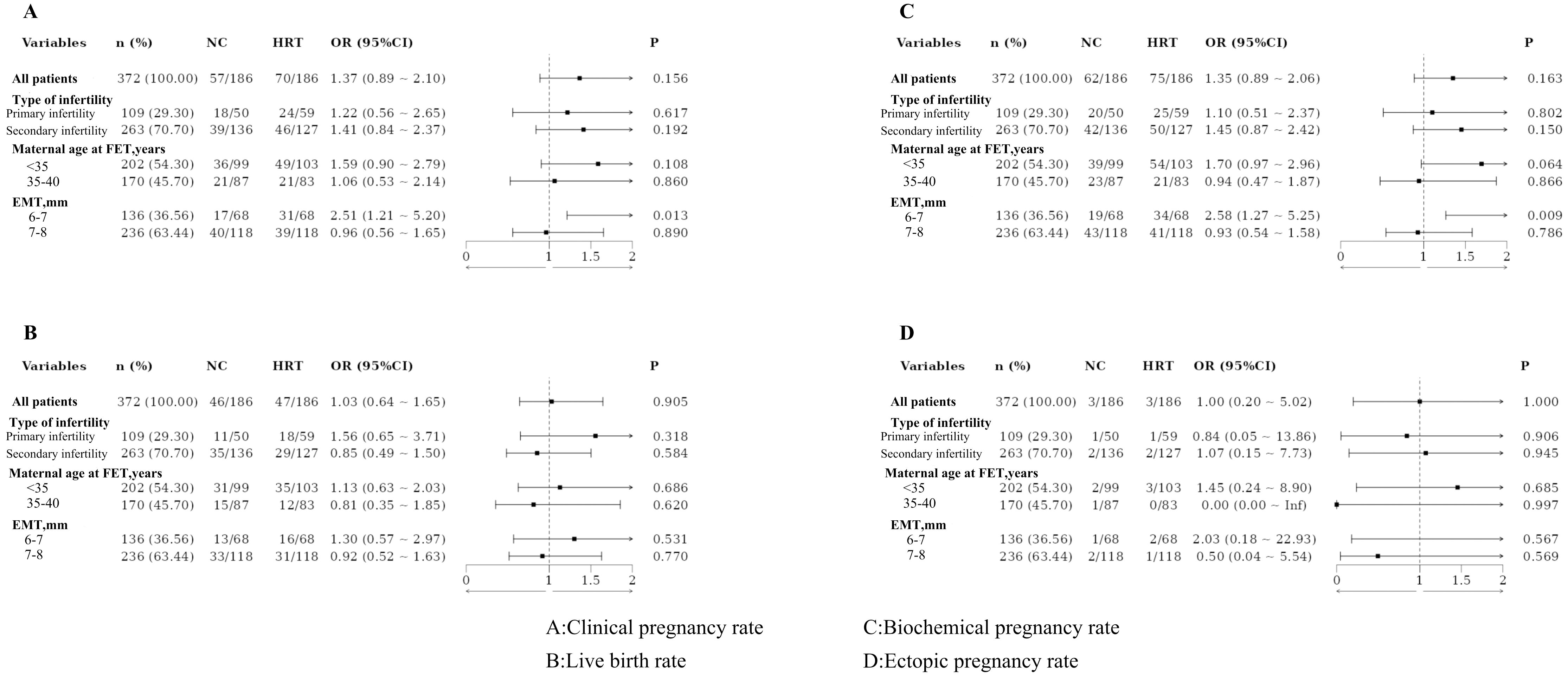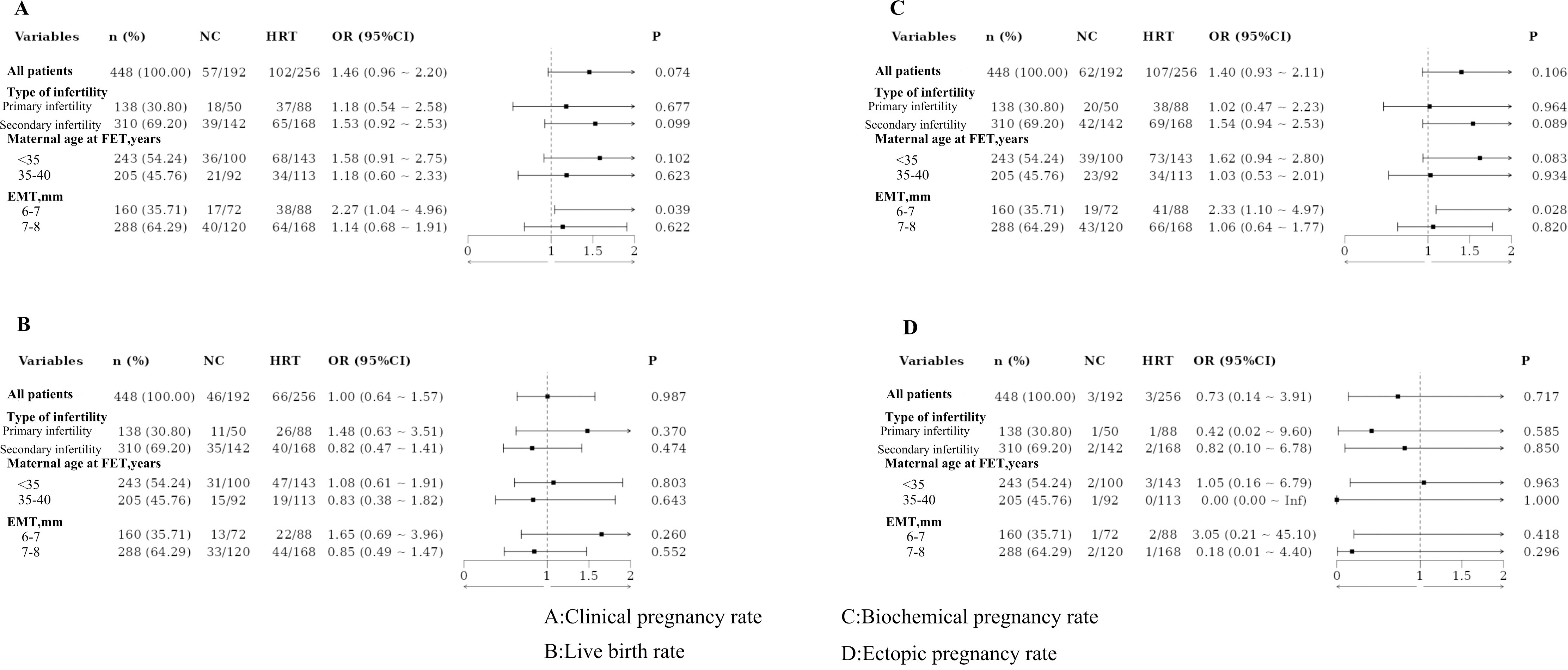 The pregnancy outcomes are presented in Table 3. After adjusting for age, BMI, duration of infertility, type of infertility, type of embryo, number of embryos transferred, and number of good-quality embryos transferred using multifactorial logistic regression, the clinical pregnancy rate, live birth rate, and biochemical pregnancy rate were higher in the HRT group compared to the NC group. The ectopic pregnancy rate was lower in the HRT group, but this difference was not statistically significant.