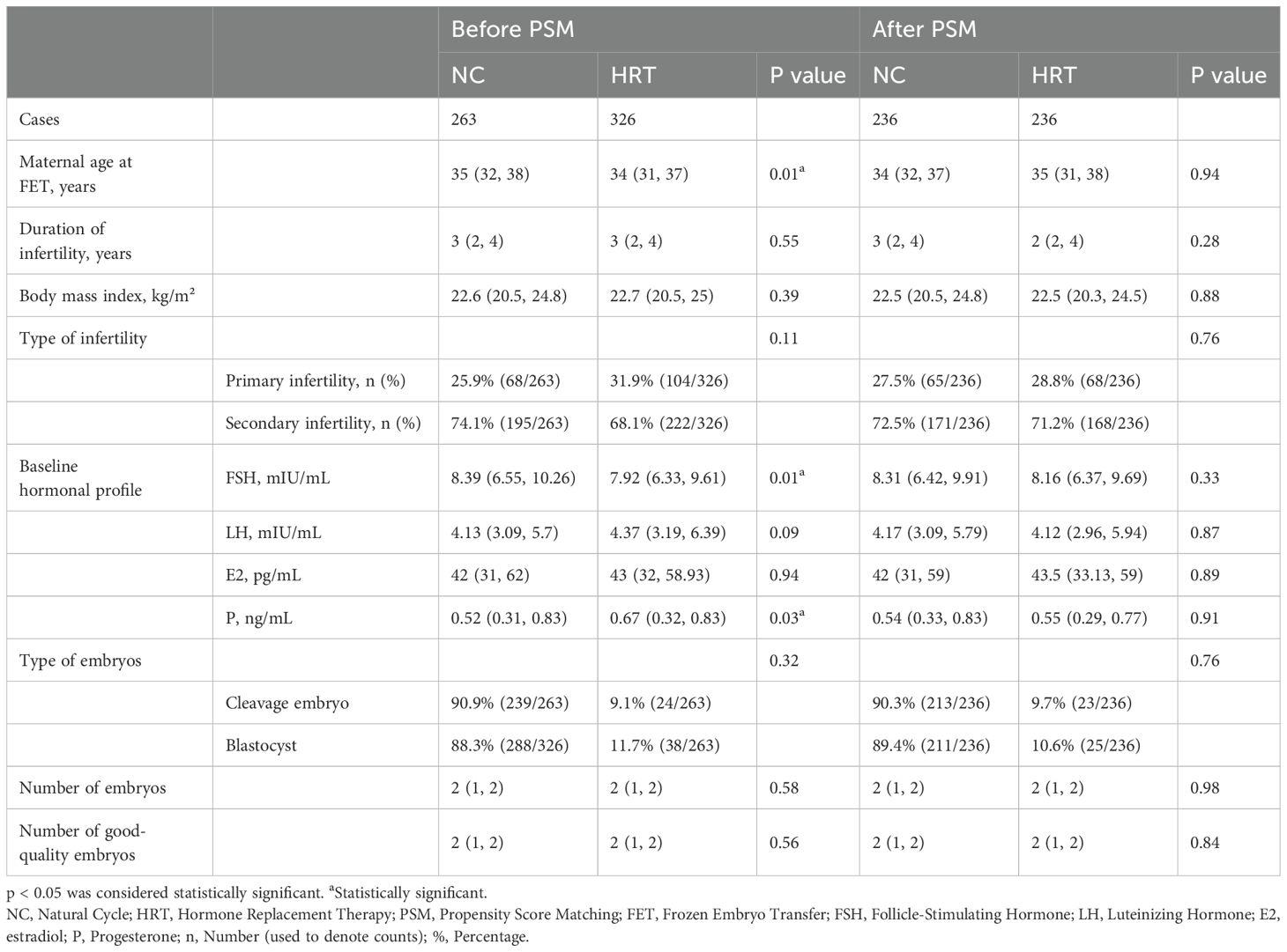 According to the inclusion and exclusion criteria, a total of 448 FET cycles were analyzed in patients with a TE. Of these, 256 were in the HRT group, and 192 were in the NC group. The baseline characteristics of the patients are detailed in Table 1. Before PSM, differences in the basal FSH levels between the two groups were statistically significant (p < 0.05). After PSM, there were no statistically significant differences between the two groups regarding maternal age at FET, BMI, duration of infertility, type of infertility, type and number of embryos, and number of good-quality embryos. Good-quality embryos were defined as those graded 2 or higher with 6–10 cleavage globules on the third day after egg retrieval or embryos graded BB or higher on the fifth day.