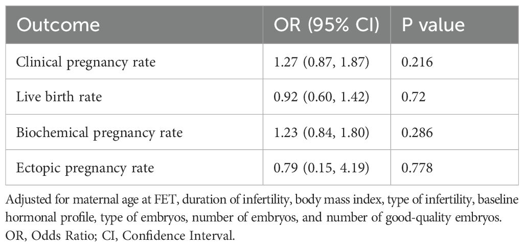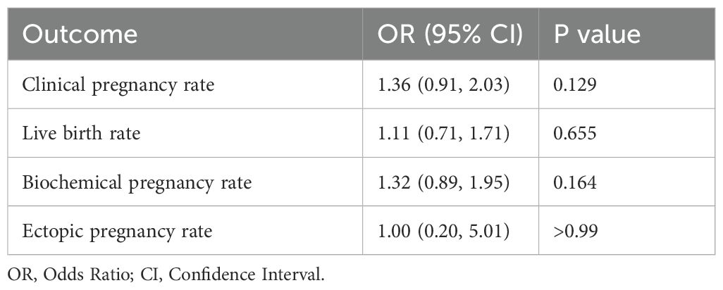 The primary outcomes of this study were clinical pregnancy and live birth rates. Secondary outcomes were biochemical pregnancy and ectopic pregnancy rates. Clinical pregnancy was identified by ultrasound detection of at least one gestational sac within the uterine cavity approximately 28 days after embryo transfer. Live birth was defined as the delivery of at least one living fetus. Biochemical pregnancy was identified as having a serum β-HCG level >5 mIU/mL approximately 14 days post-embryo transfer. Ectopic pregnancy was characterized by embryonic development outside the uterine cavity.