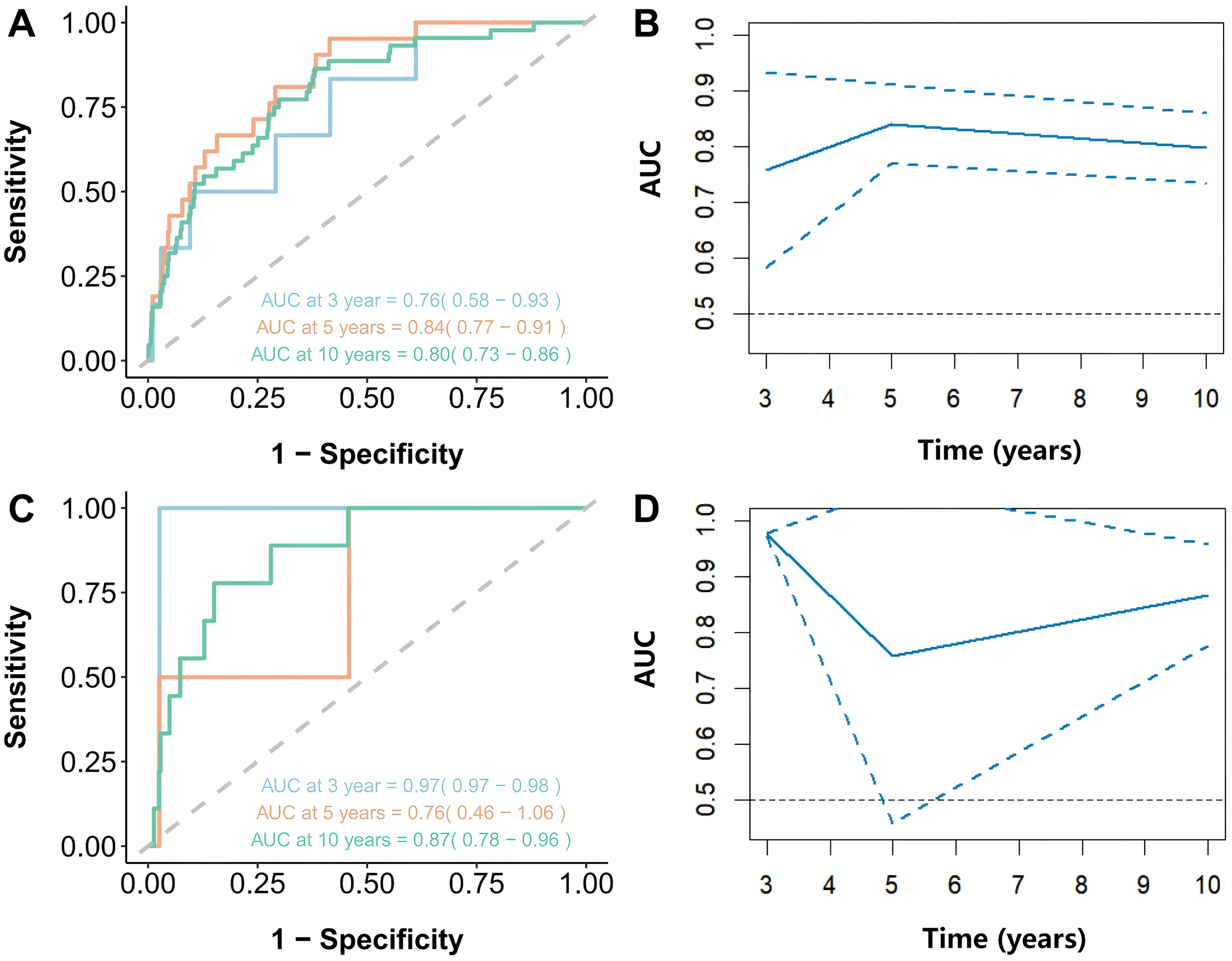 The predictive accuracy of NHHR for 3-year, 5-year, and 10-year survival outcomes was assessed using receiver operating characteristic (ROC) curves generated by the “timeROC” software. All analyses were conducted using R version 4.2.3 and EmpowerStats, with a P-value of less than 0.05 considered statistically significant.