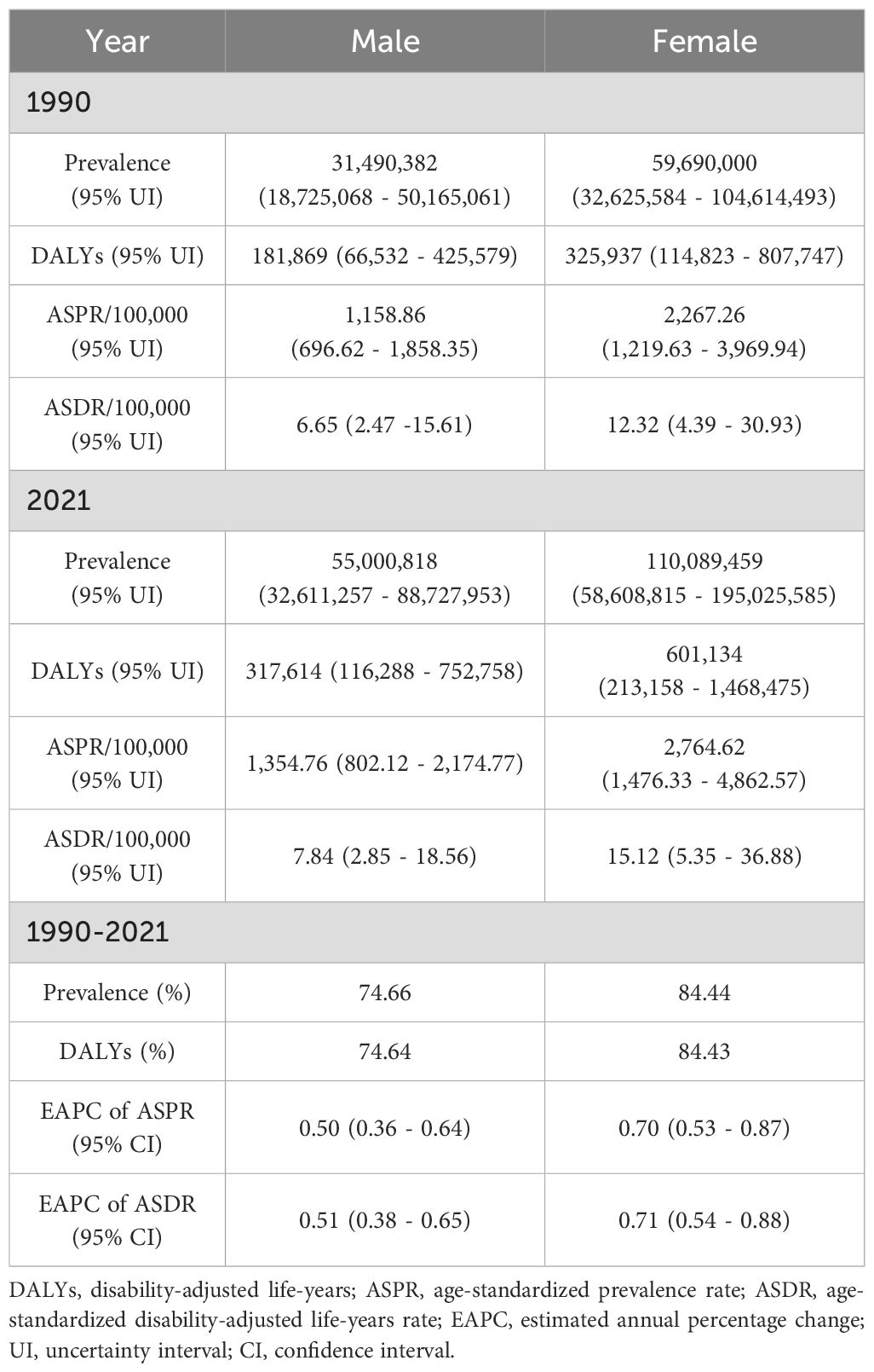 The GBD is a global research initiative led by the Institute for Health Metrics and Evaluation (IHME) in collaboration with various international health organizations. The project aims to comprehensively assess the impact of diseases, injuries, and risk factors on human health. The GBD study involves gathering data from various sources, and following the data collection process, potential biases within each dataset are evaluated and adjusted using the Bayesian meta-regression tool DisMod-MR 2.1 for standardized statistical modeling. The database is accessible for search and download via the official GBD website (https://www.healthdata.org/research-analysis/gbd). The GBD 2021 offers comprehensive data on prevalence, incidence, mortality, DALYs, and age-standardized rate (ASR) associated with 369 health hazards spanning various diseases and injuries, alongside 88 risk factors across 204 countries and territories (15). The Ethics Committee of the First Hospital of Jilin University determined that no approval was needed in this study because all data used were publicly available with no disclosure of personal information or privacy involved.