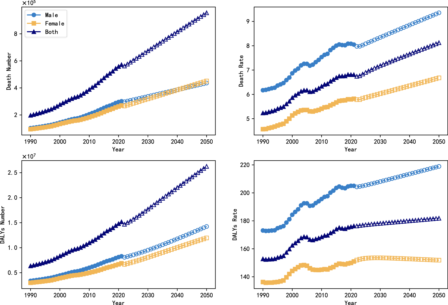 Mortality, number of deaths, and disability-adjusted life year (DALYs) rates for chronic kidney disease caused by T1DM and T2DM were extracted in the GBD Database 2021 study. We obtained disease data from the GBD database for 1990-2021(http://ghdx.healthdata.org/gbd-results-tool). The GBD 2021 study covers the health burden of 371 diseases and injuries in 204 countries and territories, covering age, gender, country, and region. Global and country-level data are available for each year from 1990 to 2021 (14). The GBD database collects health survey data, hospital records, clinical research data, disease registry system data, death records, national health statistics reports, data released by international organizations, academic research papers, and many other data types from all countries (15). The disease burden of CKD was expressed in terms of mortality and DALYs. Global data on chronic kidney disease caused by T1DM and T2DM were collected: number of deaths, age-standardized mortality (ASMR), DALYs, and age-standardized DALYs rates (16). The incidence of chronic kidney disease refers to the incidence per 100,000 people. We use age-standardized rates to account for the rapid growth of the population and the diverse age composition. Among them, DALY combined with years of life lost (YLL) and years lost due to disability (YLD) was used to measure the burden of chronic kidney disease caused by T1DM and T2DM. The GBD database uses Standard Life Table, DisMod-MR 2.1 model and other methods to integrate data from multiple sources and adjust morbidity and mortality rates for consistency, thus improving the accuracy and comparability of the data (17).