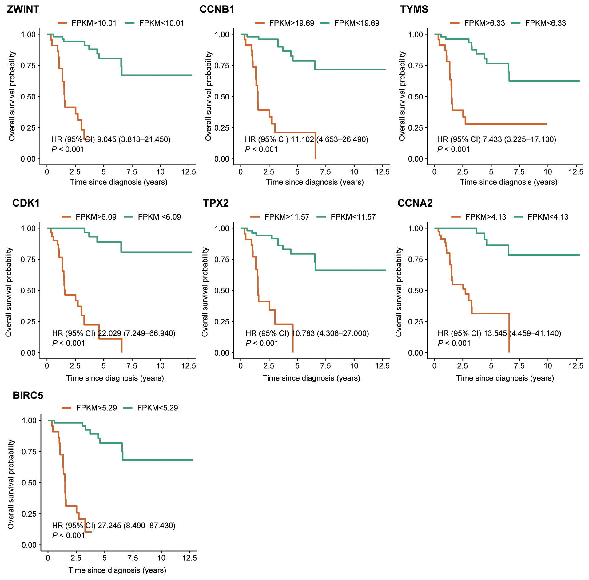 Kaplan–Meier survival analysis of the seven hub genes. Patients were grouped into high-expression and low-expression categories based on pre-defined cut-off values.